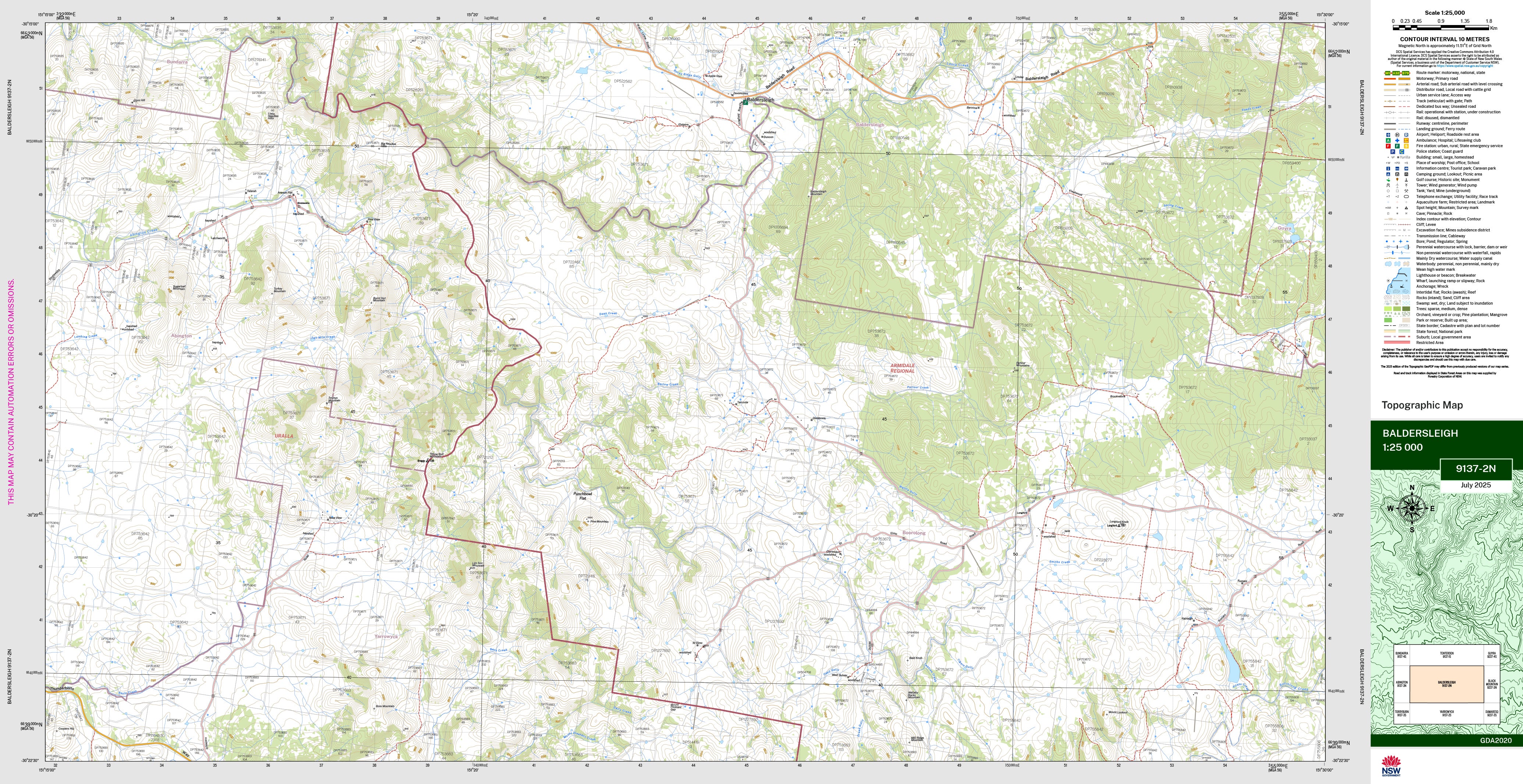 The Baldersleigh topographic map by LPI shows contours, streams, roads, tracks, buildings, place names, points of interest, vegetation, selected administrative boundaries and much more.