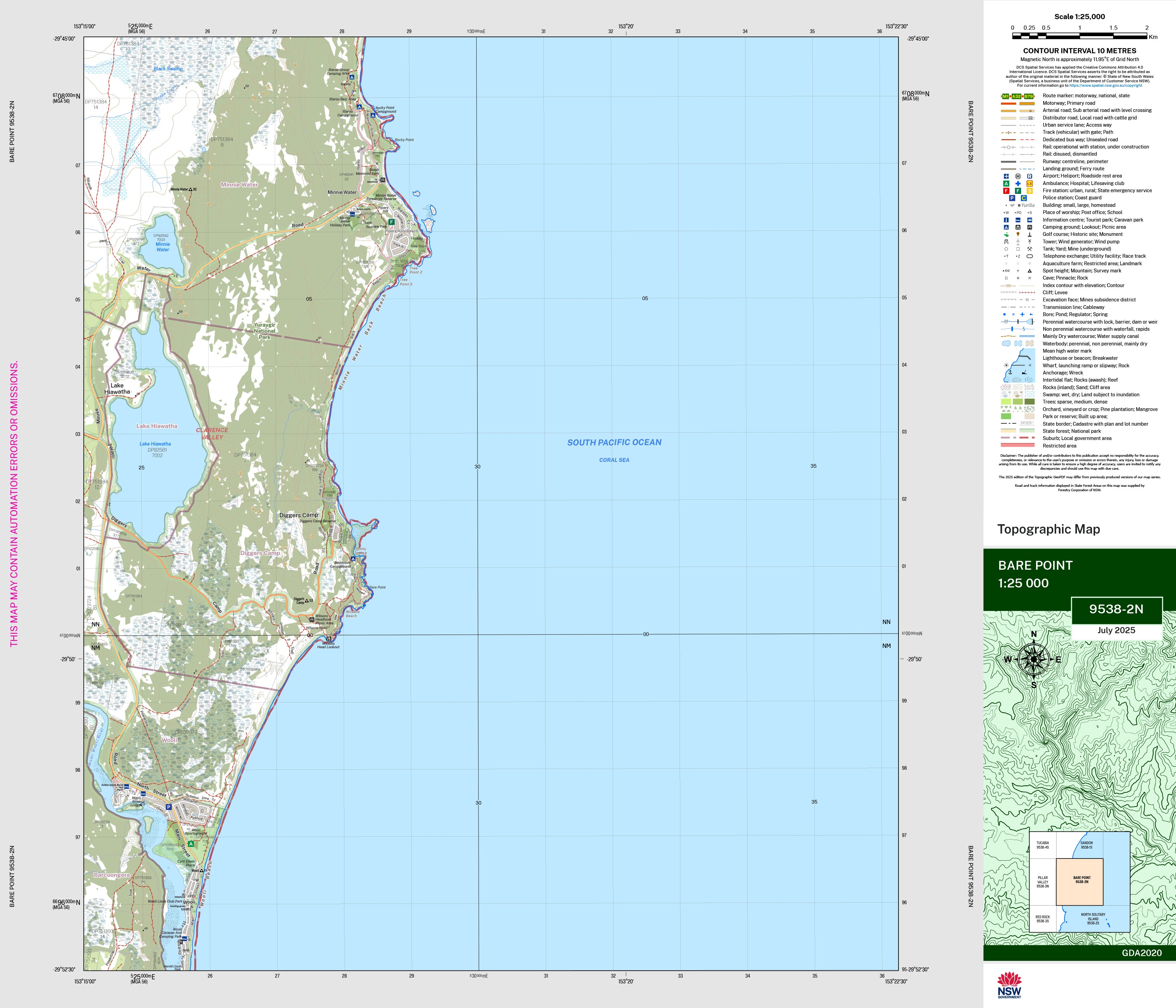 The Bare Point 1:25,000 scale New South Wales topographic map shows contours, streams, roads, tracks, buildings, place names, points of interest, vegetation, selected administrative boundaries and much more.