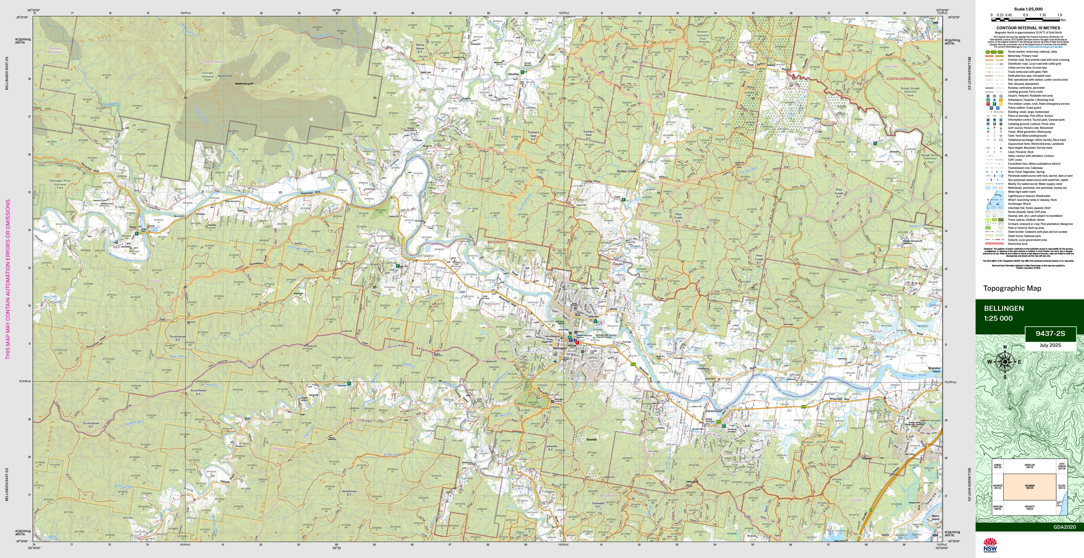 The Bellingen topographic map by LPI shows contours, streams, roads, tracks, buildings, place names, points of interest, vegetation, selected administrative boundaries and much more.