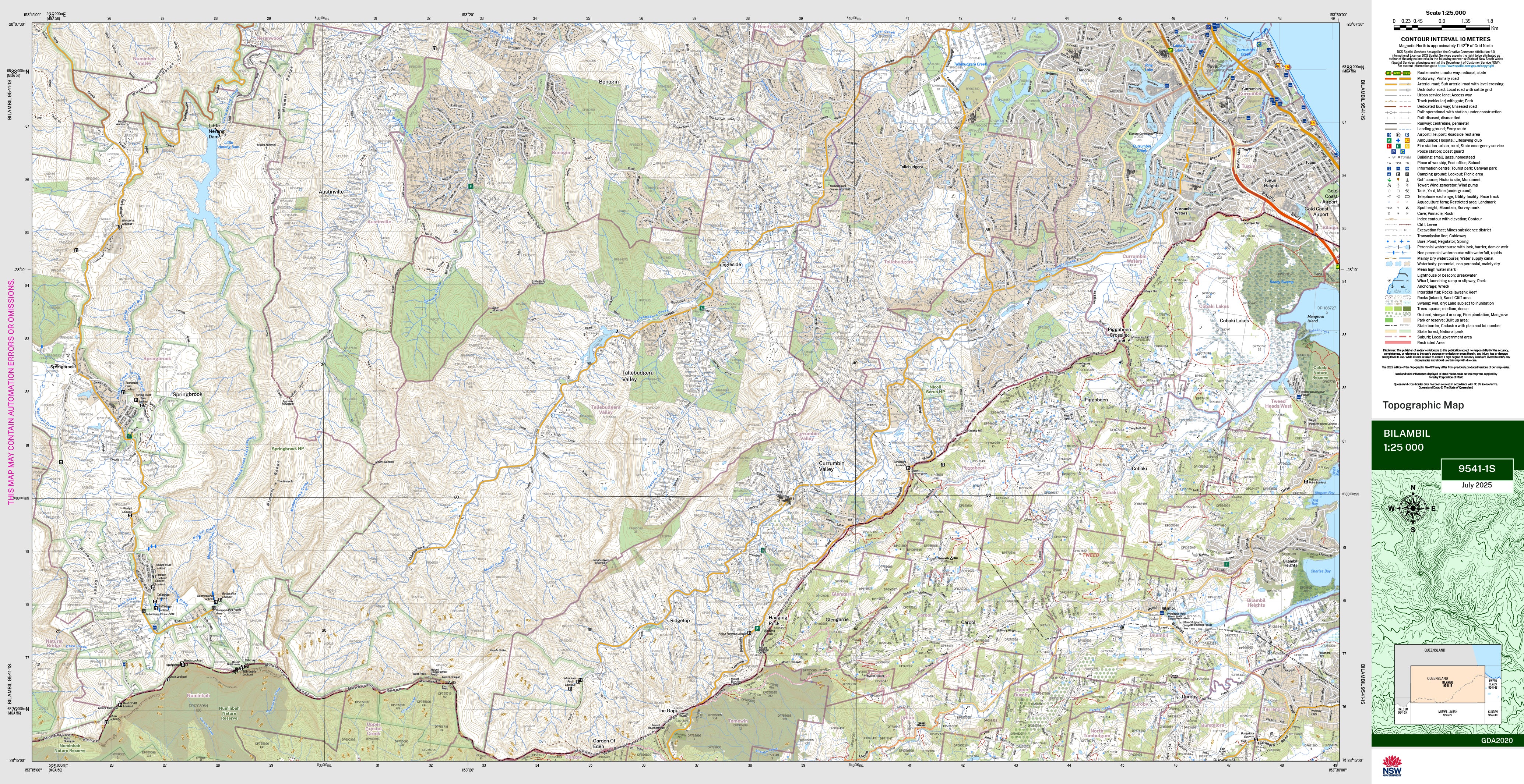 The Bilambil topographic map by LPI shows contours, streams, roads, tracks, buildings, place names, points of interest, vegetation, selected administrative boundaries and much more.
