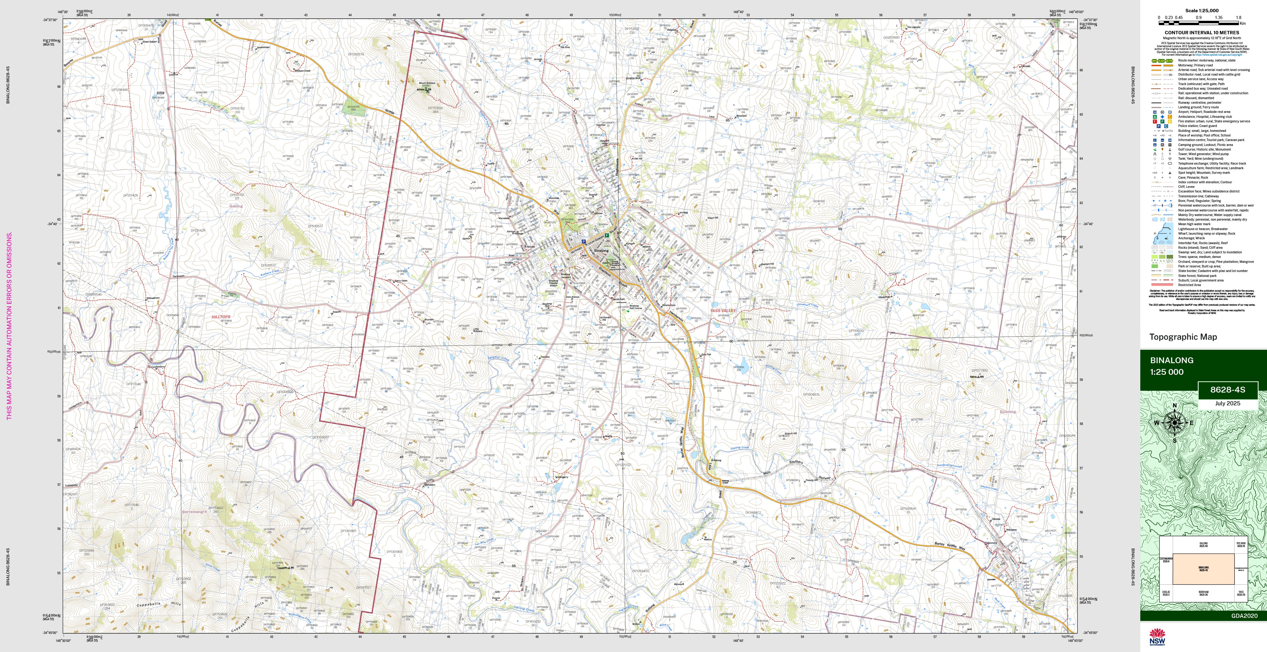 The Binalong 1:25,000 scale New South Wales topographic map shows contours, streams, roads, tracks, buildings, place names, points of interest, vegetation, selected administrative boundaries and much more.