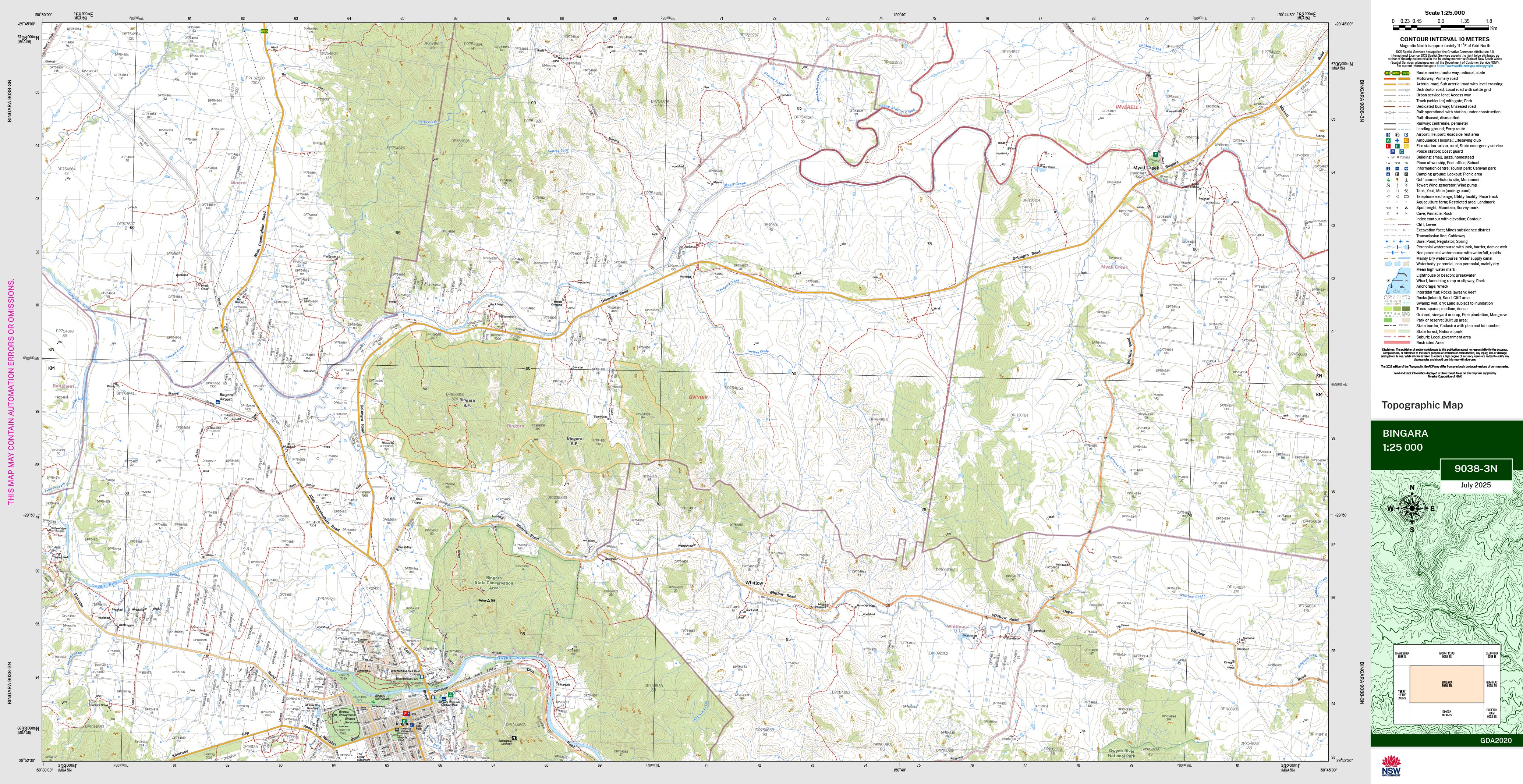 The Bingara topographic map by LPI shows contours, streams, roads, tracks, buildings, place names, points of interest, vegetation, selected administrative boundaries and much more.