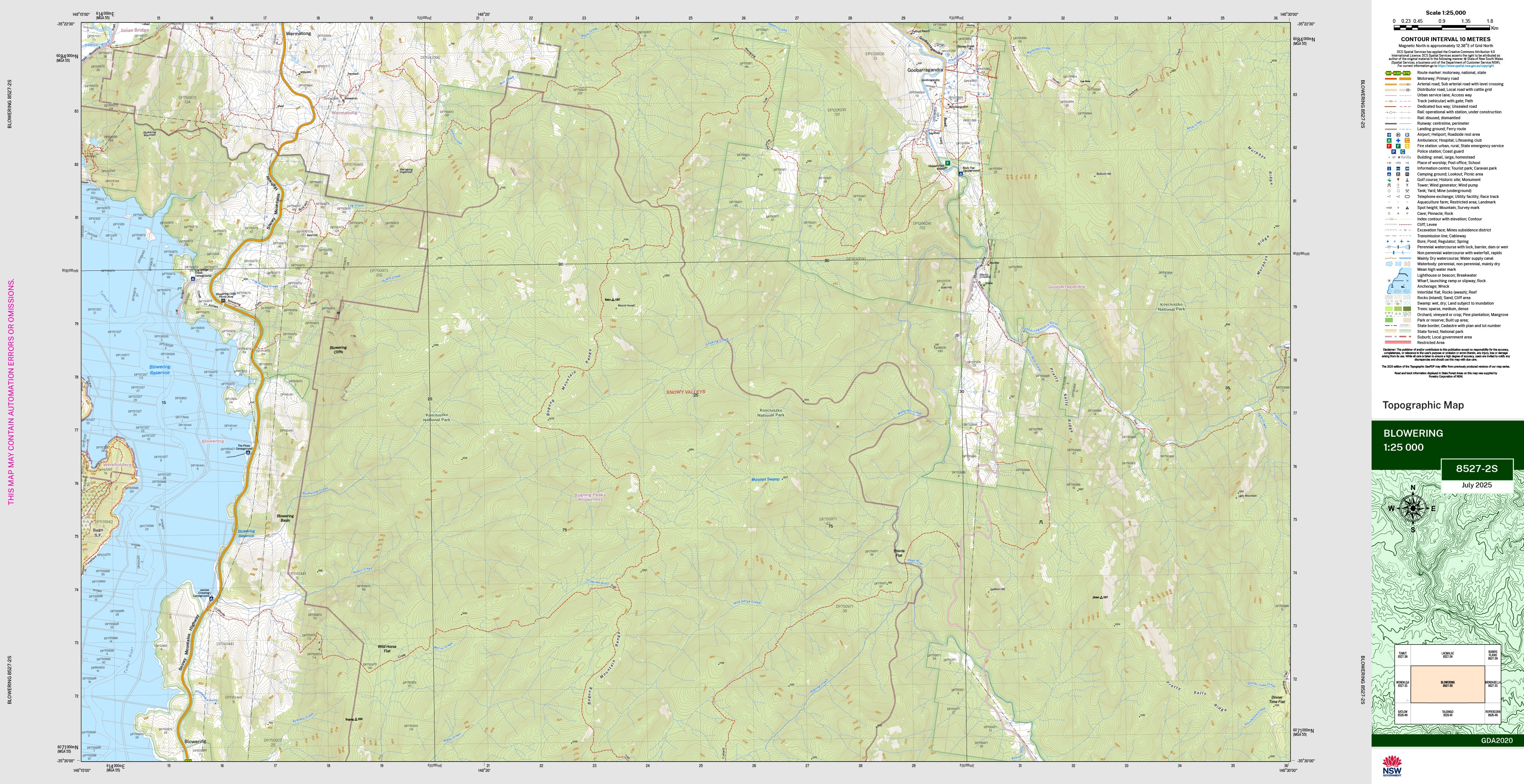 The Blowering topographic map by LPI shows contours, streams, roads, tracks, buildings, place names, points of interest, vegetation, selected administrative boundaries and much more.