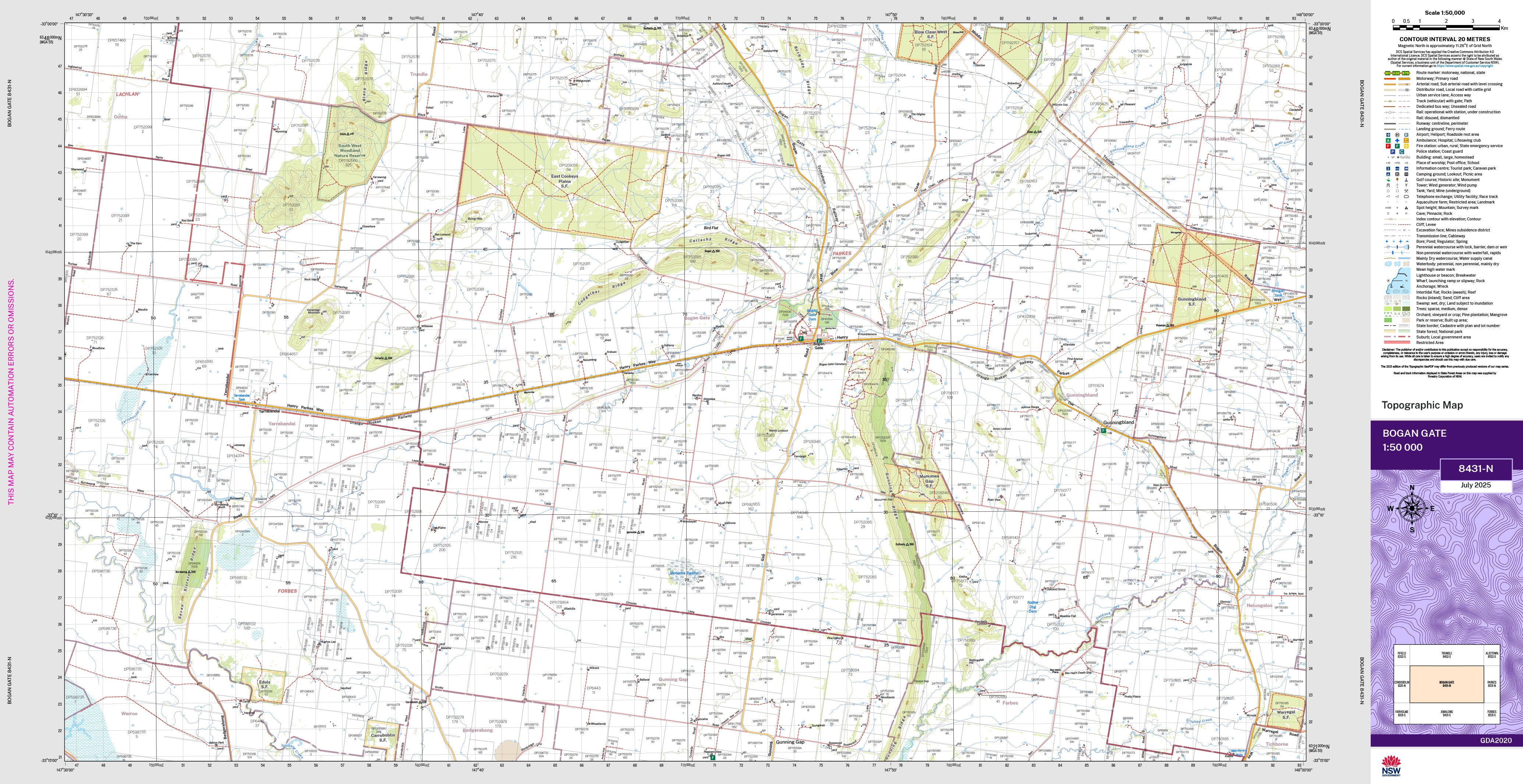 The Bogan Gate 1:50,000 scale New South Wales topographic map shows contours, streams, roads, tracks, buildings, place names, points of interest, vegetation, selected administrative boundaries and much more.