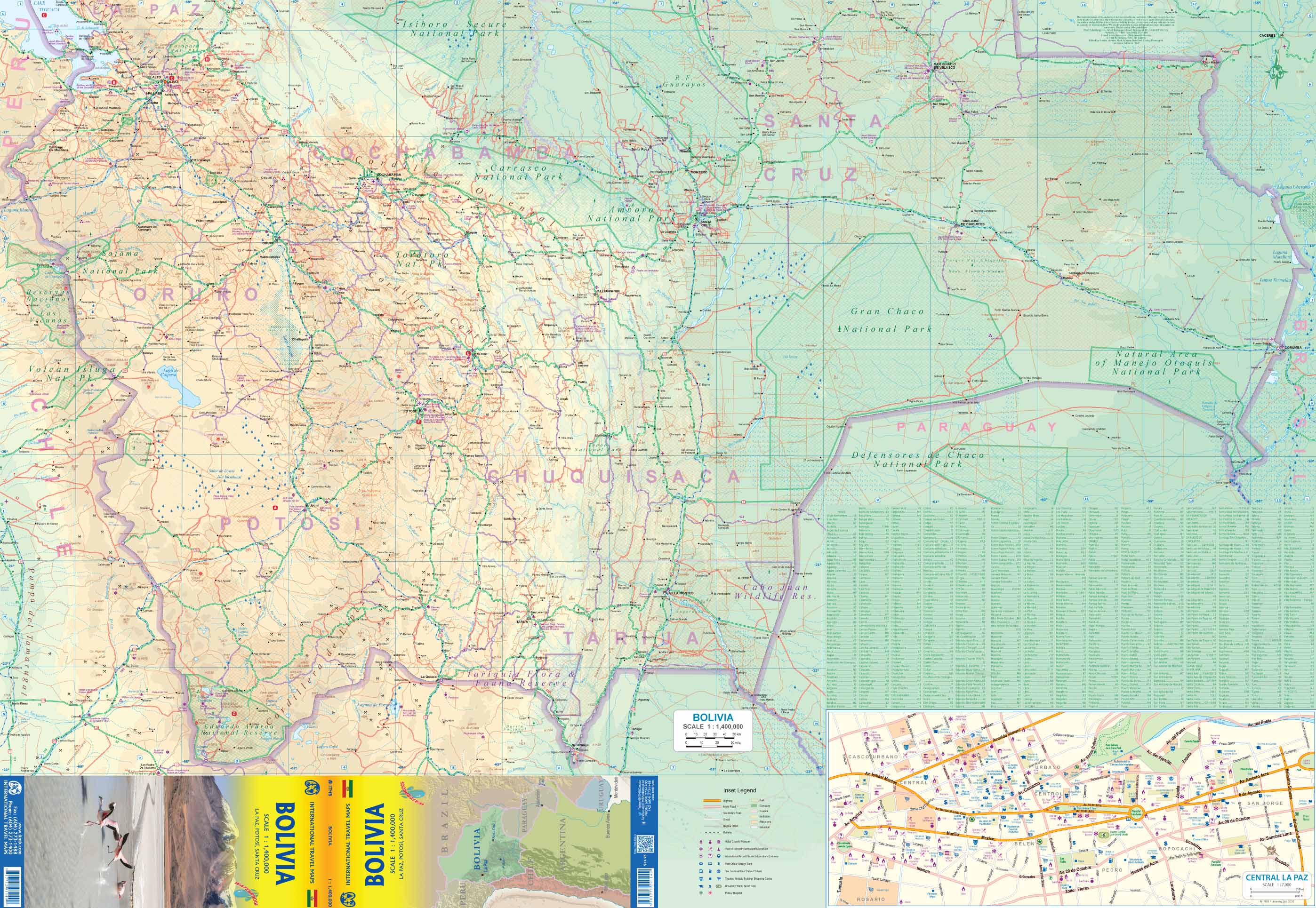 This large-format, double-sided map presents Bolivia at a scale of 1:1,250,000, giving excellent regional detail and broad coverage for trip planning or educational use.