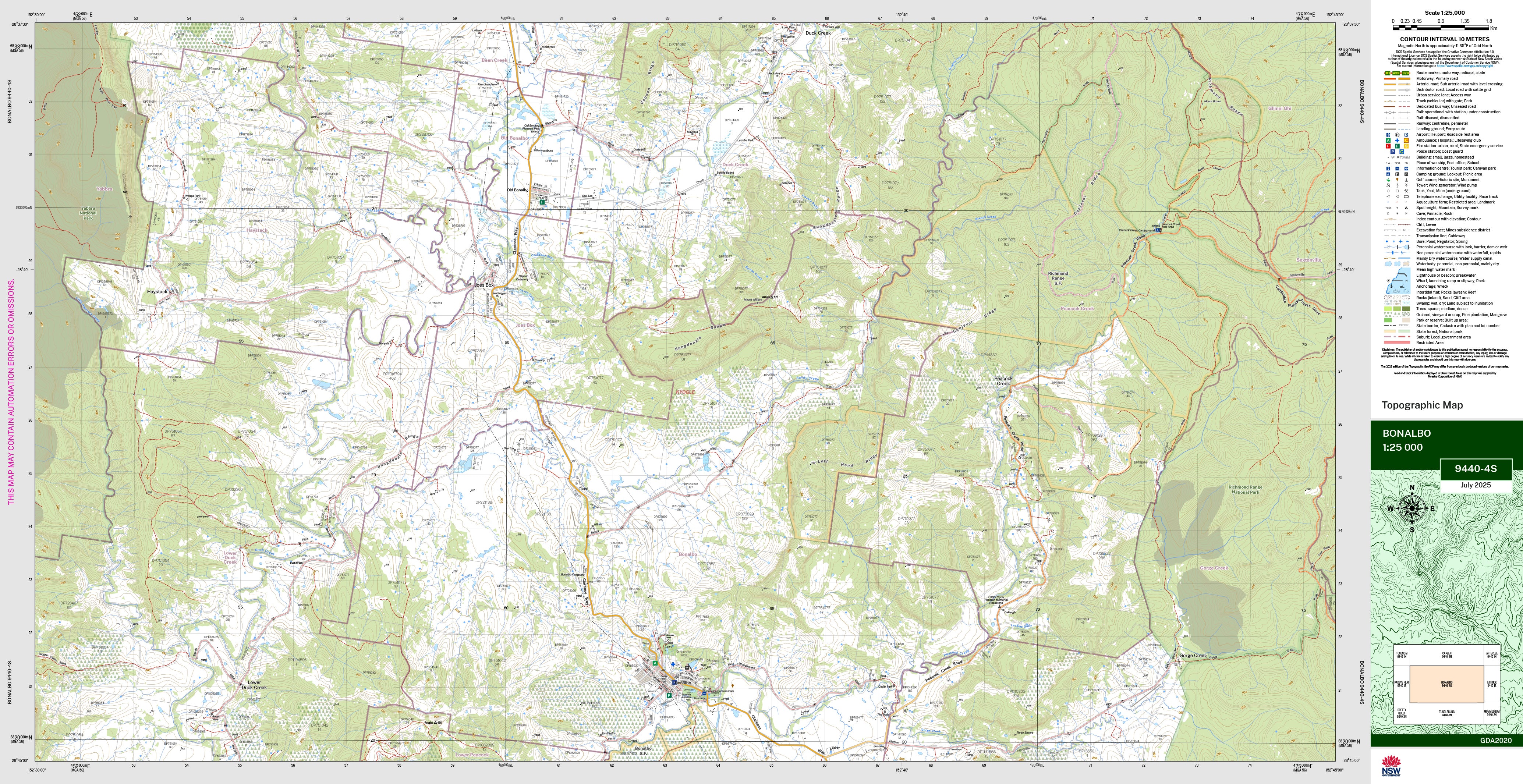 The Bonalbo 1:25,000 scale New South Wales topographic map shows contours, streams, roads, tracks, buildings, place names, points of interest, vegetation, selected administrative boundaries and much more.