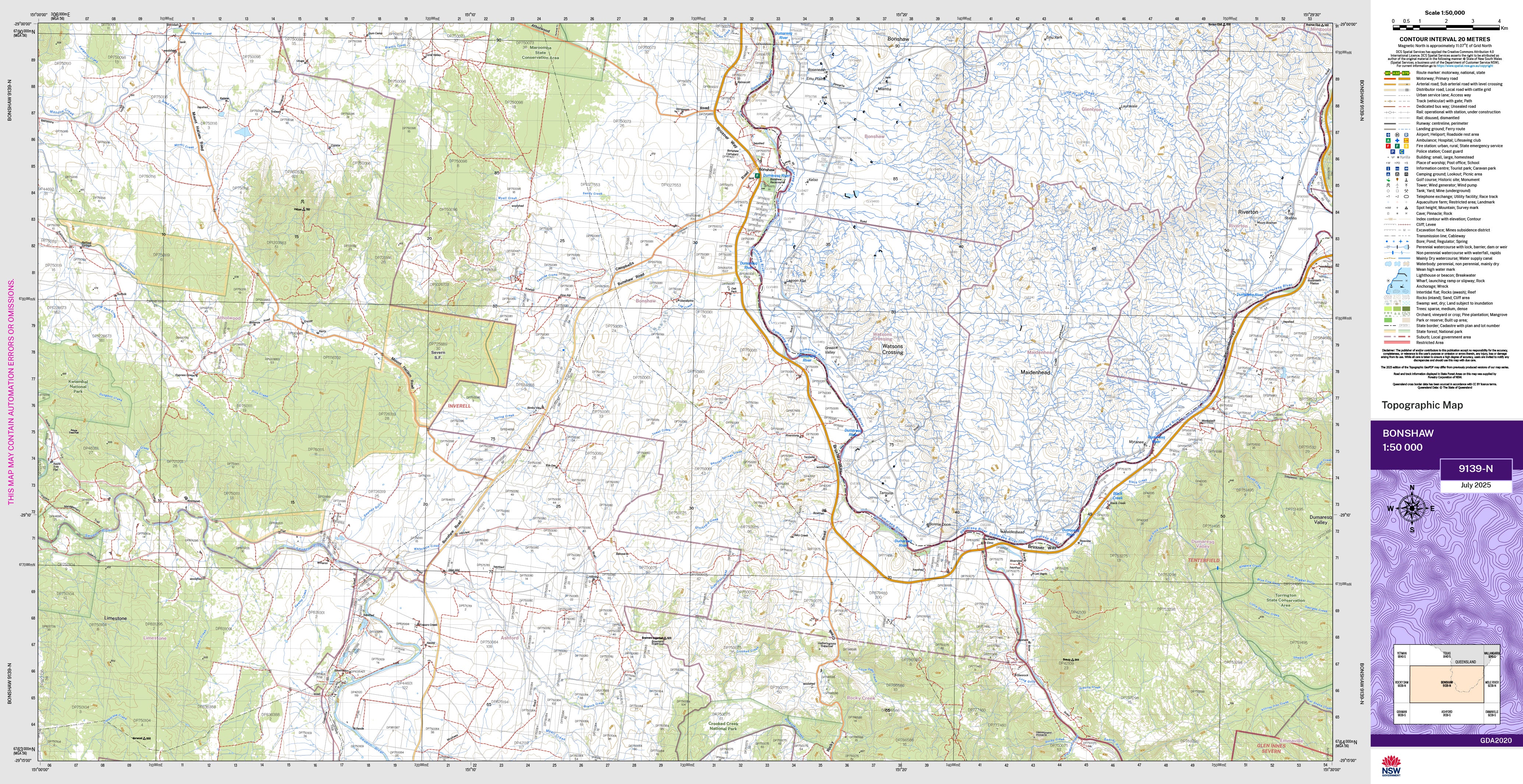The Bonshaw 1:50,000 scale New South Wales topographic map shows contours, streams, roads, tracks, buildings, place names, points of interest, vegetation, selected administrative boundaries and much more.