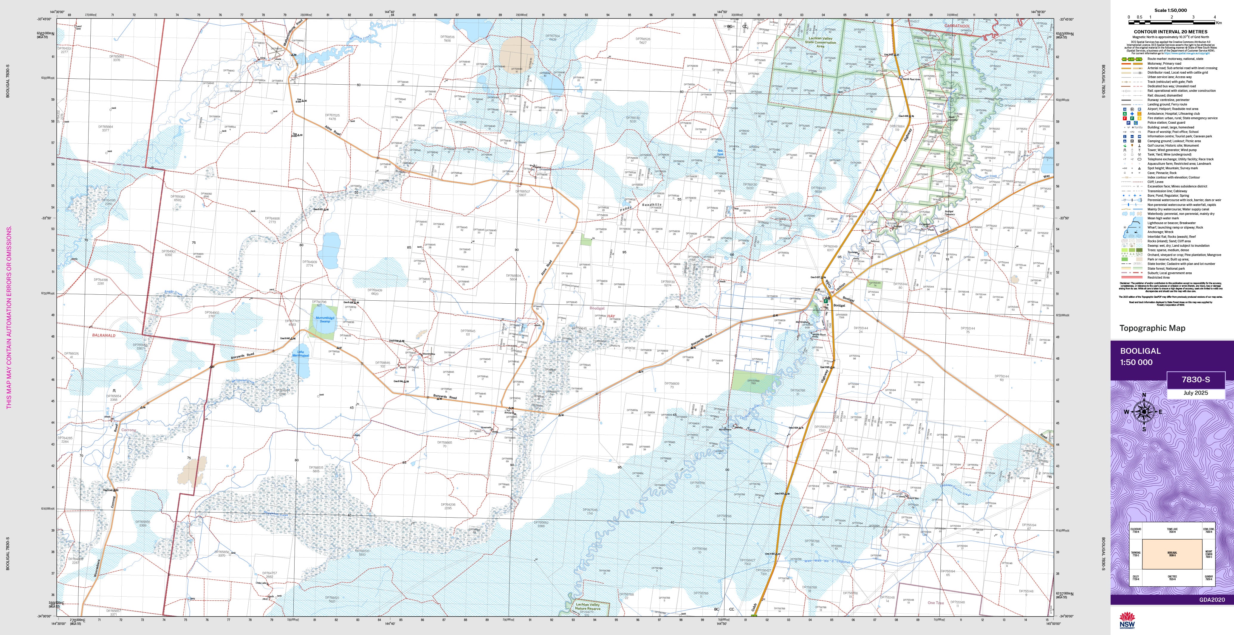 The Booligal 1:50,000 scale New South Wales topographic map shows contours, streams, roads, tracks, buildings, place names, points of interest, vegetation, selected administrative boundaries and much more.