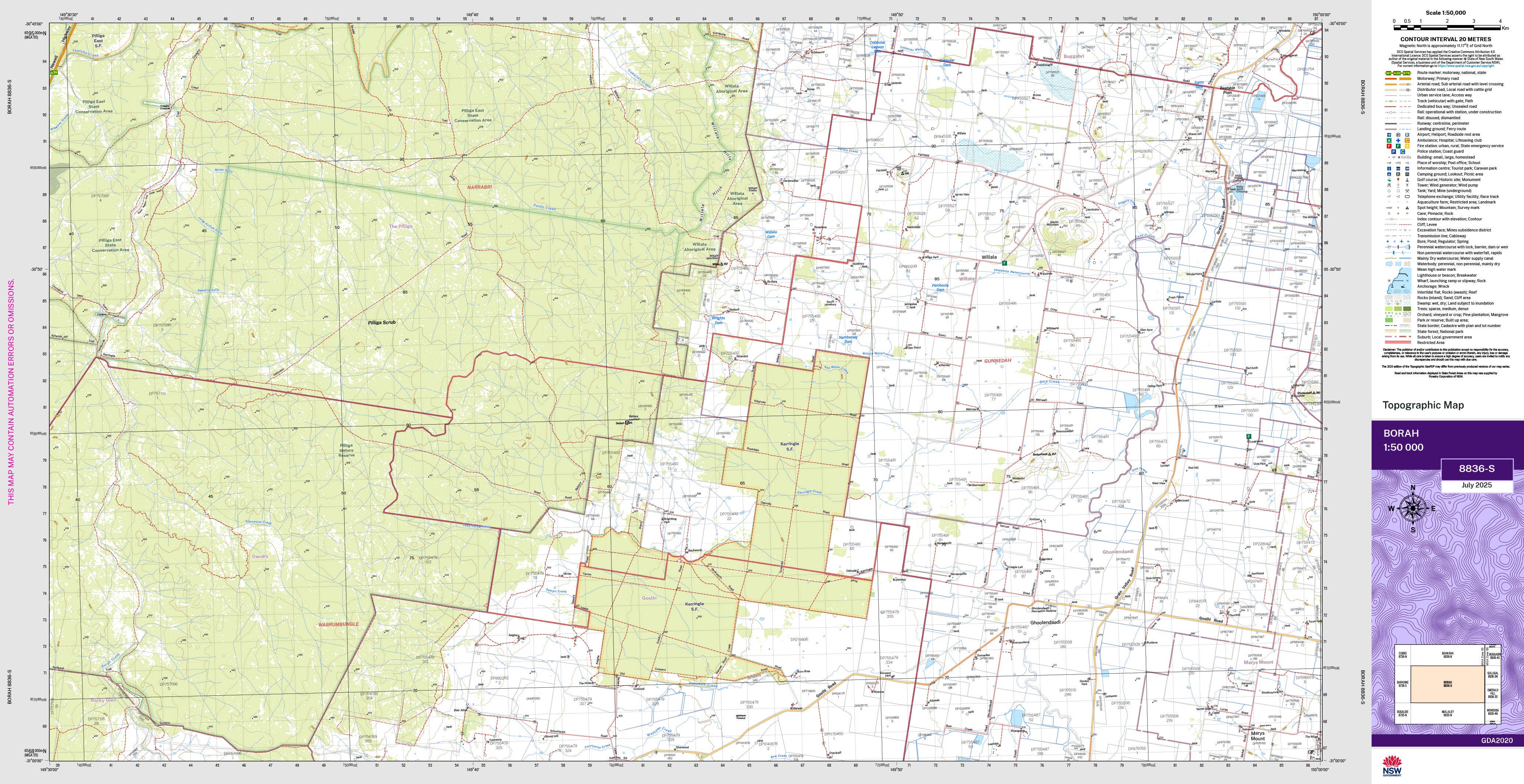 The Borah 1:50,000 scale New South Wales topographic map shows contours, streams, roads, tracks, buildings, place names, points of interest, vegetation, selected administrative boundaries and much more.