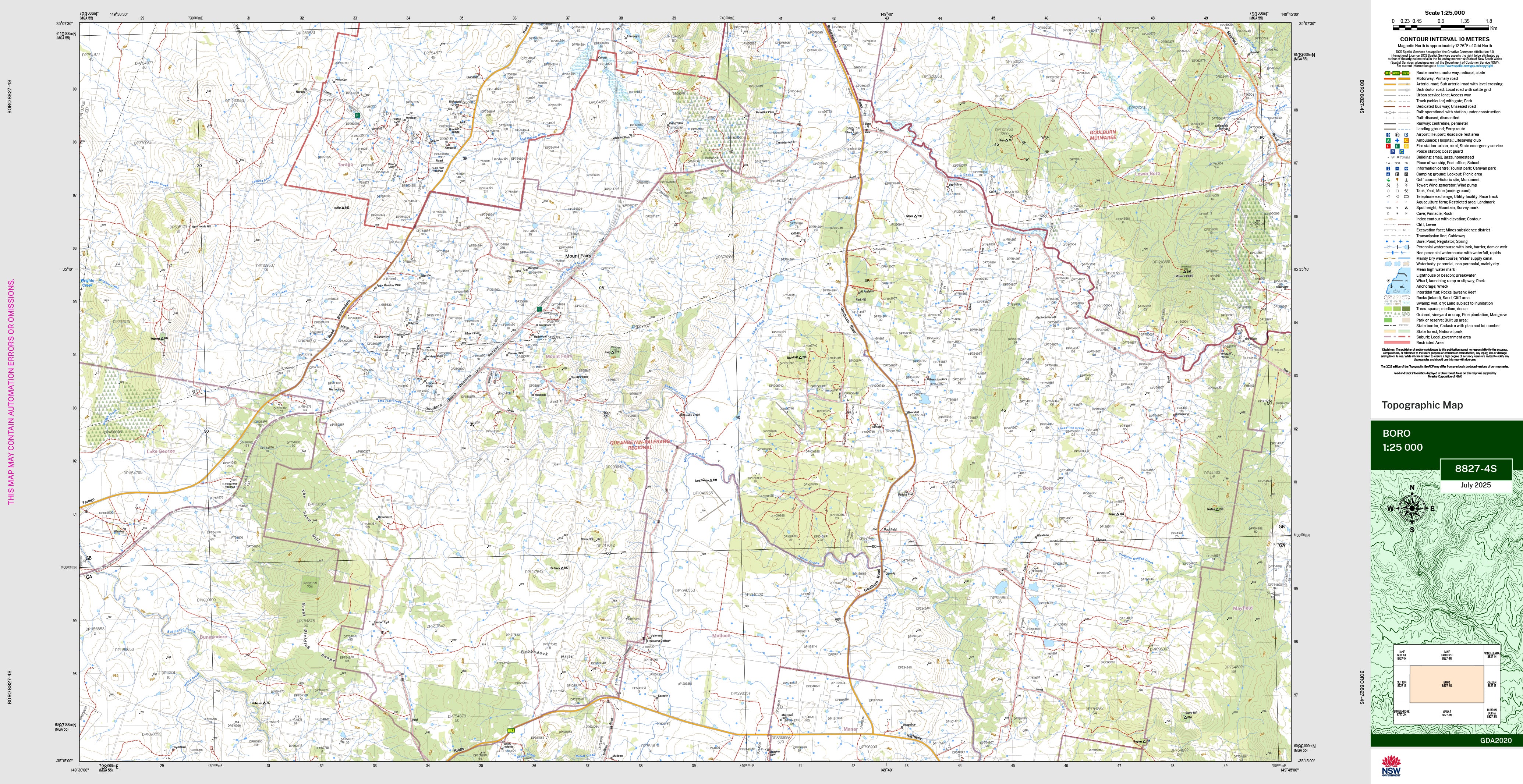The Boro topographic map by LPI shows contours, streams, roads, tracks, buildings, place names, points of interest, vegetation, selected administrative boundaries and much more.