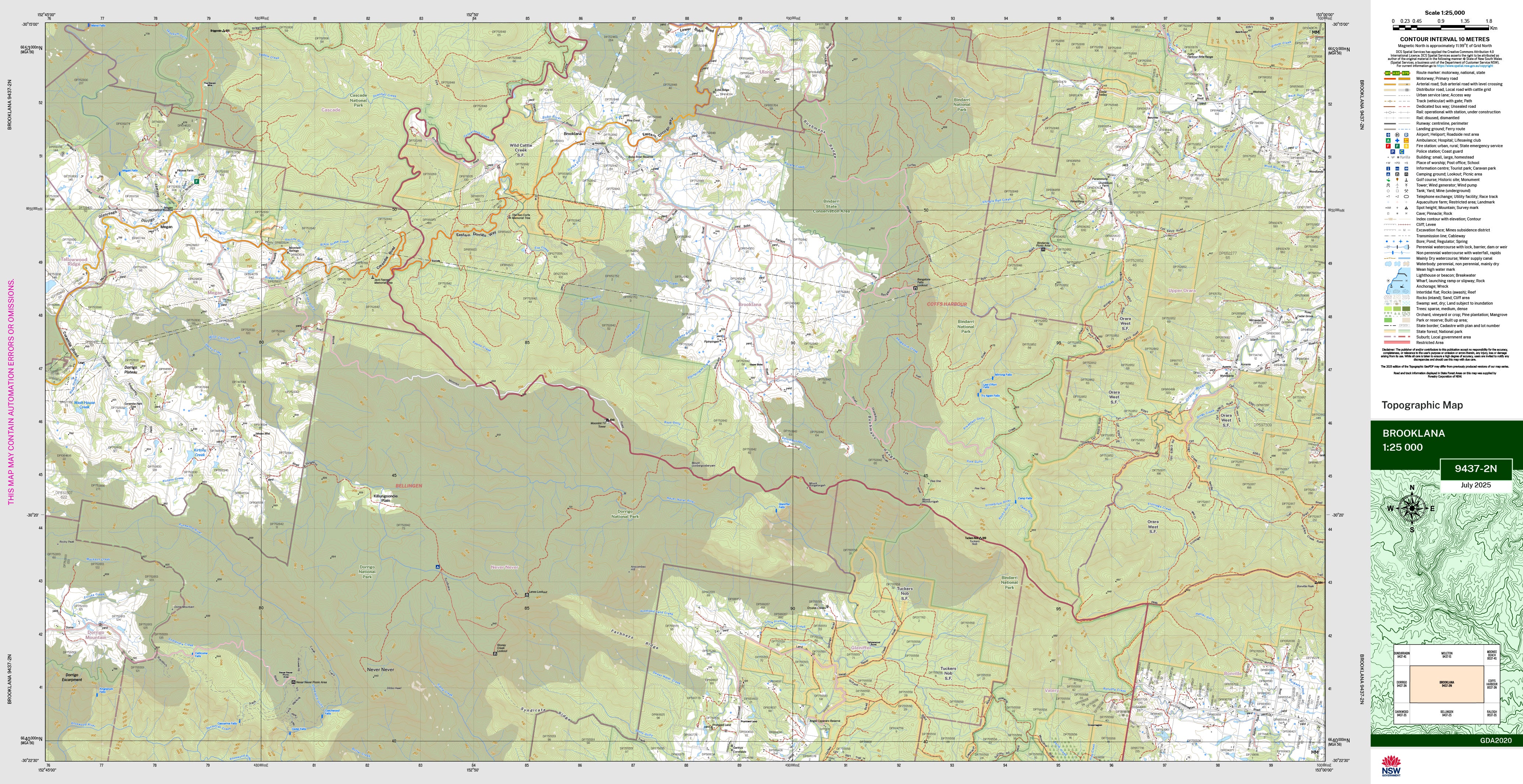 The Brooklana topographic map by LPI shows contours, streams, roads, tracks, buildings, place names, points of interest, vegetation, selected administrative boundaries and much more.