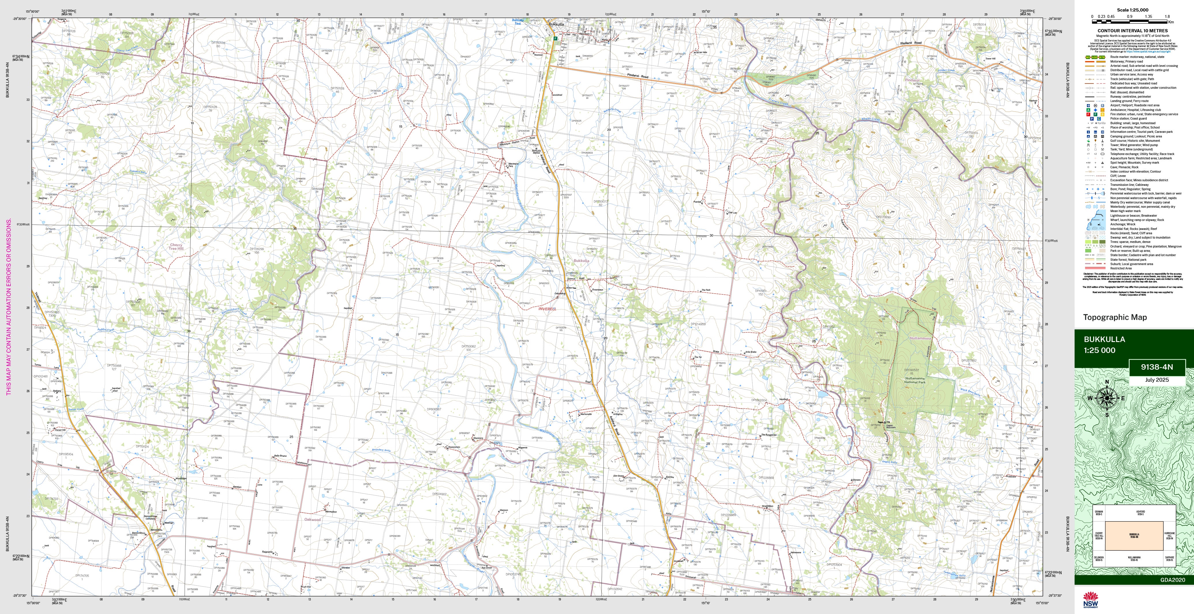 The Bukkulla topographic map by LPI shows contours, streams, roads, tracks, buildings, place names, points of interest, vegetation, selected administrative boundaries and much more.