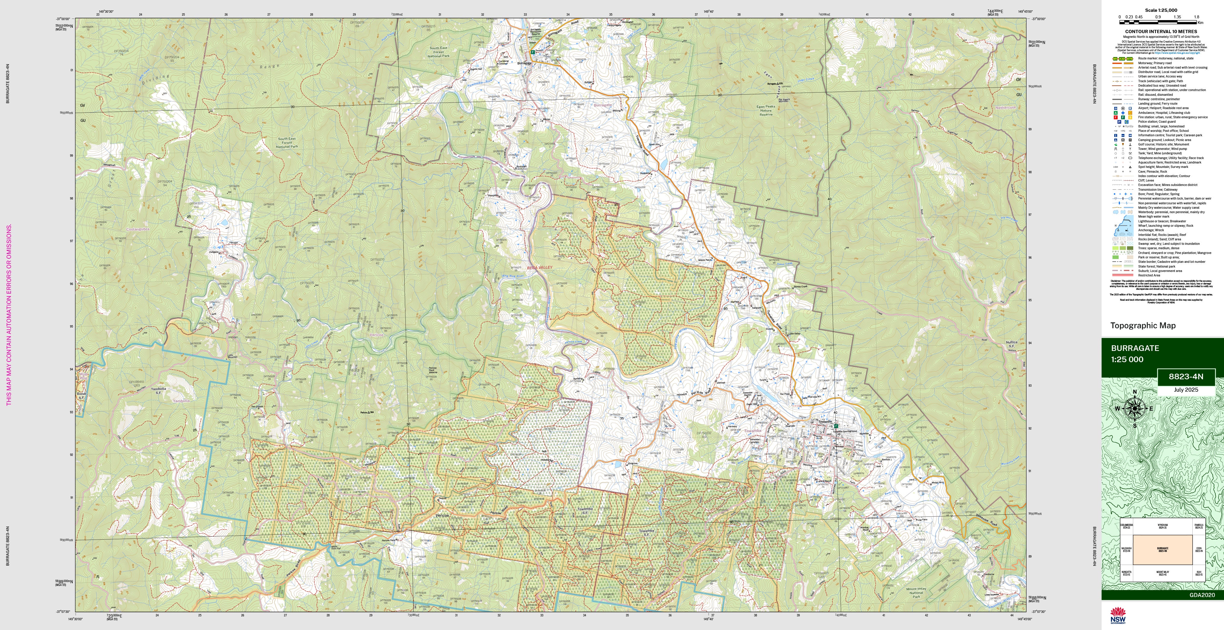 The Burragate topographic map by LPI shows contours, streams, roads, tracks, buildings, place names, points of interest, vegetation, selected administrative boundaries and much more.