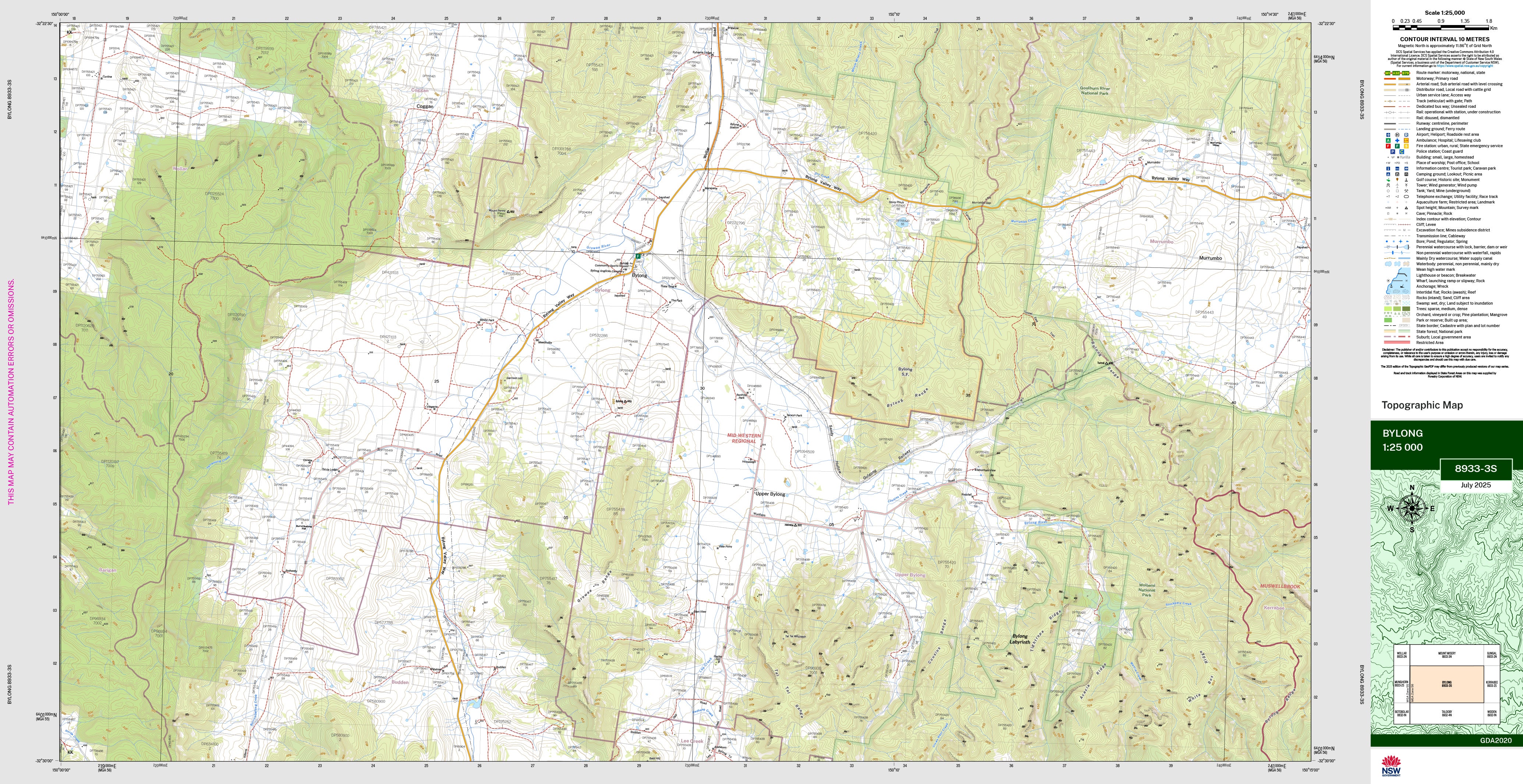 The Bylong topographic map by LPI shows contours, streams, roads, tracks, buildings, place names, points of interest, vegetation, selected administrative boundaries and much more.