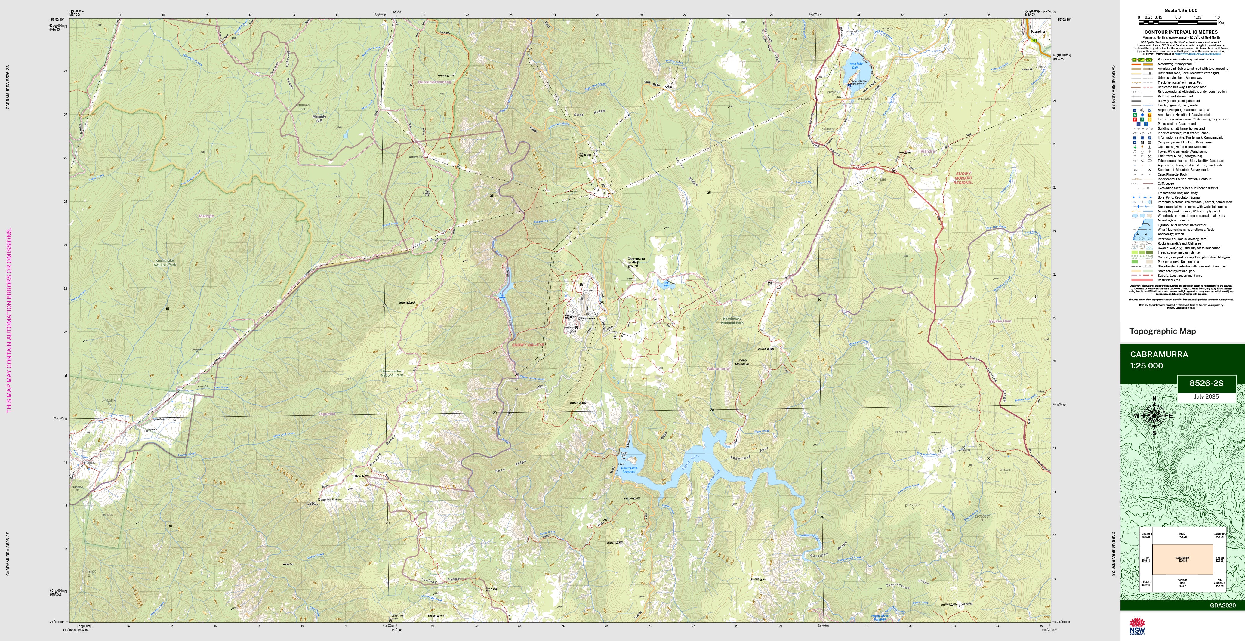 The Cabramurra topographic map by LPI shows contours, streams, roads, tracks, buildings, place names, points of interest, vegetation, selected administrative boundaries and much more.