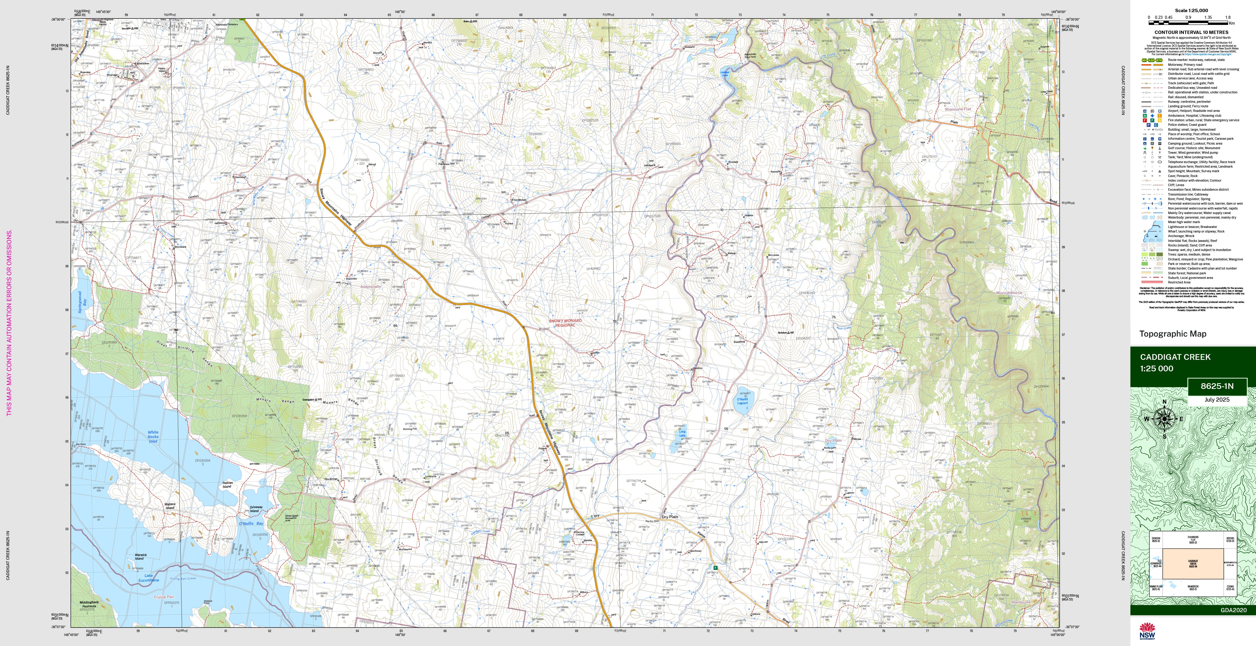 The Caddigat Creek 1:25,000 scale New South Wales topographic map shows contours, streams, roads, tracks, buildings, place names, points of interest, vegetation, selected administrative boundaries and much more.