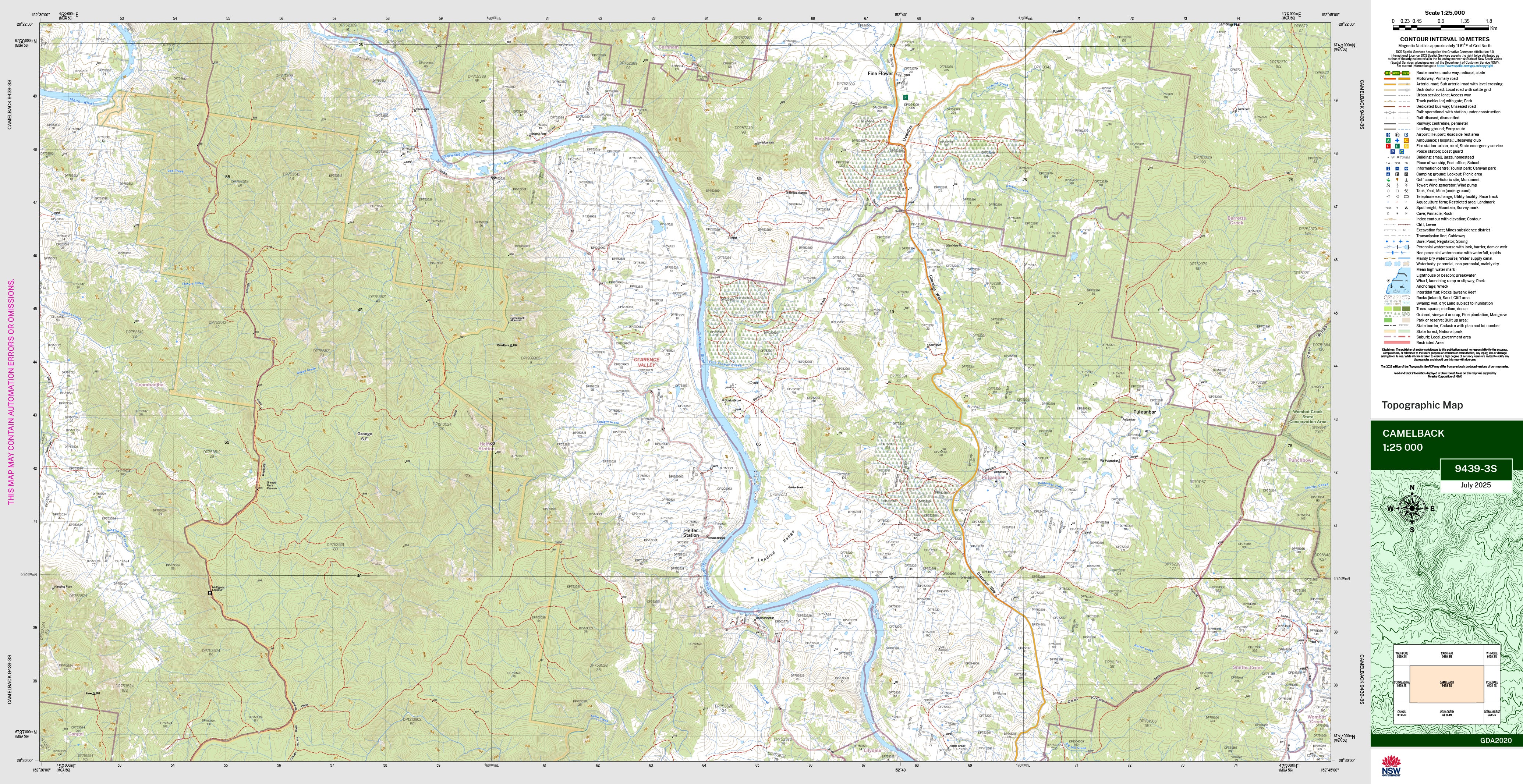 The Camelback 1:25,000 scale New South Wales topographic map shows contours, streams, roads, tracks, buildings, place names, points of interest, vegetation, selected administrative boundaries and much more.