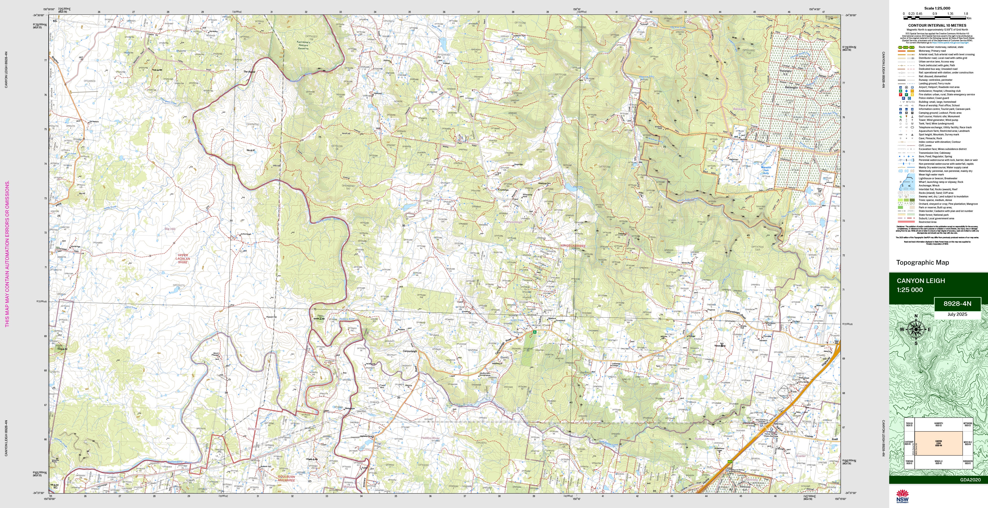 The Canyonleigh 1:25,000 topographic map shows contours, streams, roads, tracks, buildings, place names, points of interest, vegetation, selected administrative boundaries and much more.