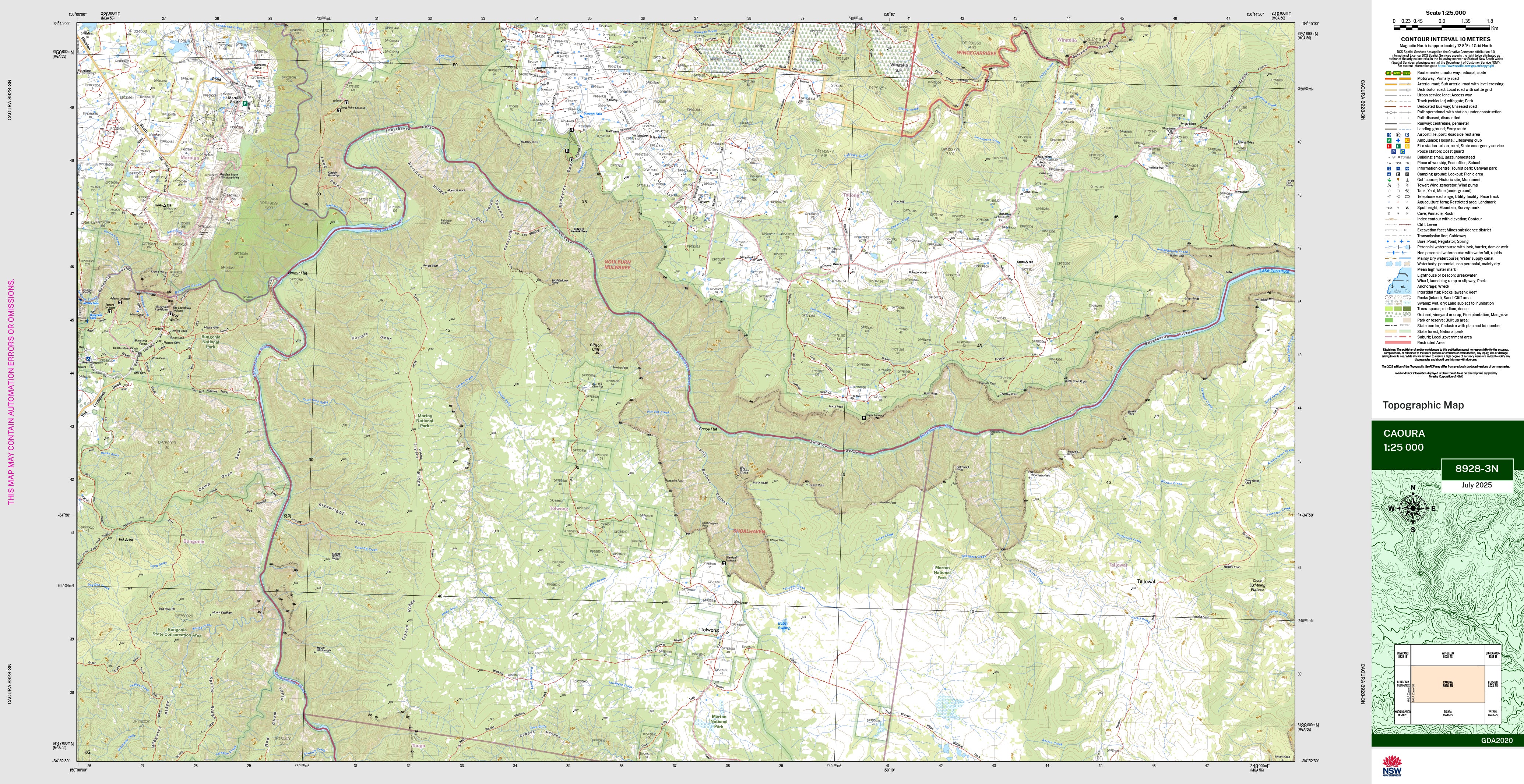 The Caoura 1:25,000 topographic map shows contours, streams, roads, tracks, buildings, place names, points of interest, vegetation, selected administrative boundaries and much more.