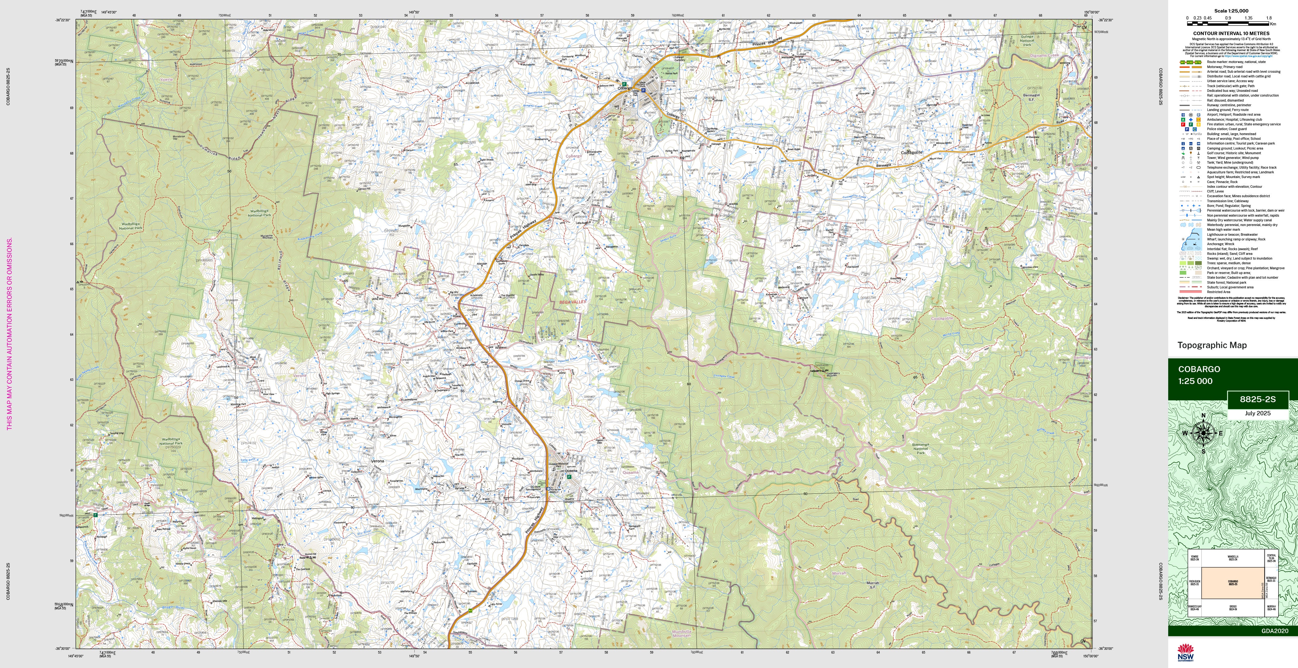 The Cobargo 1:25,000 scale New South Wales topographic map shows contours, streams, roads, tracks, buildings, place names, points of interest, vegetation, selected administrative boundaries and much more.