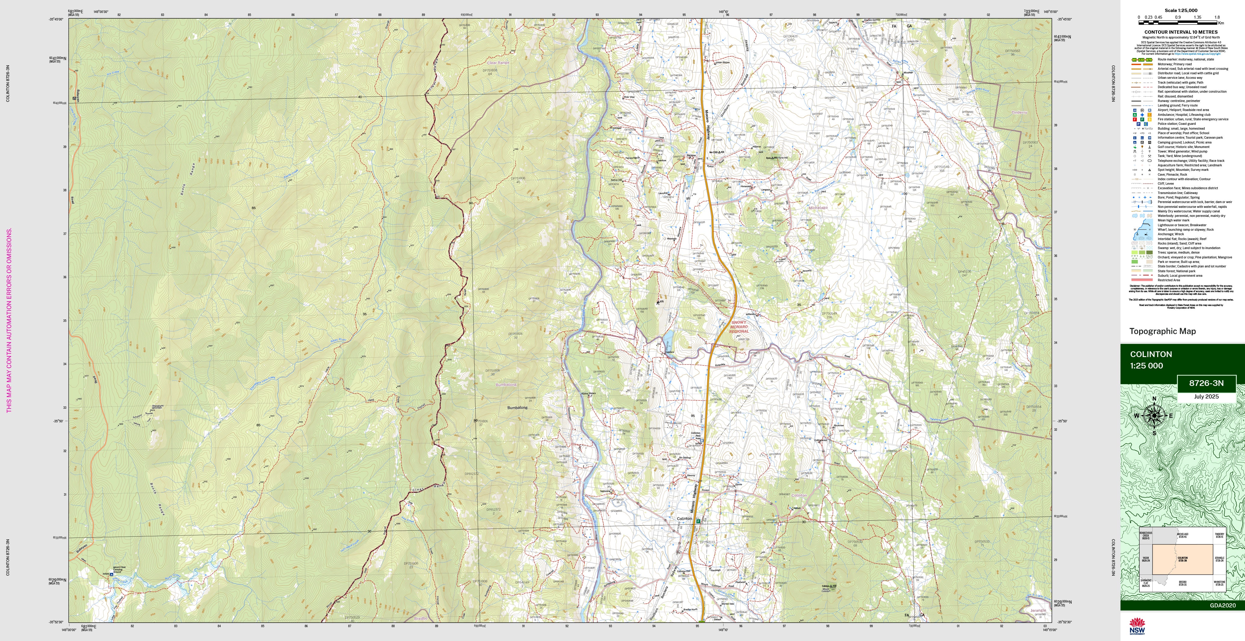 The Colinton 1:25,000 scale New South Wales topographic map shows contours, streams, roads, tracks, buildings, place names, points of interest, vegetation, selected administrative boundaries and much more.