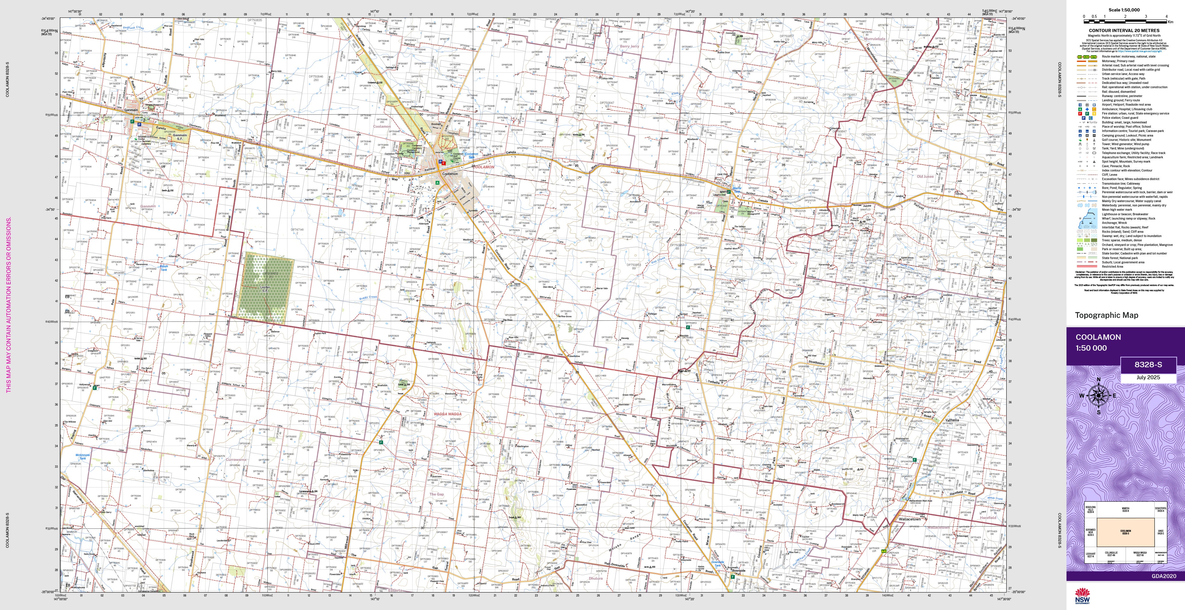 The Coolamon 1:50,000 scale New South Wales topographic map shows contours, streams, roads, tracks, buildings, place names, points of interest, vegetation, selected administrative boundaries and much more.