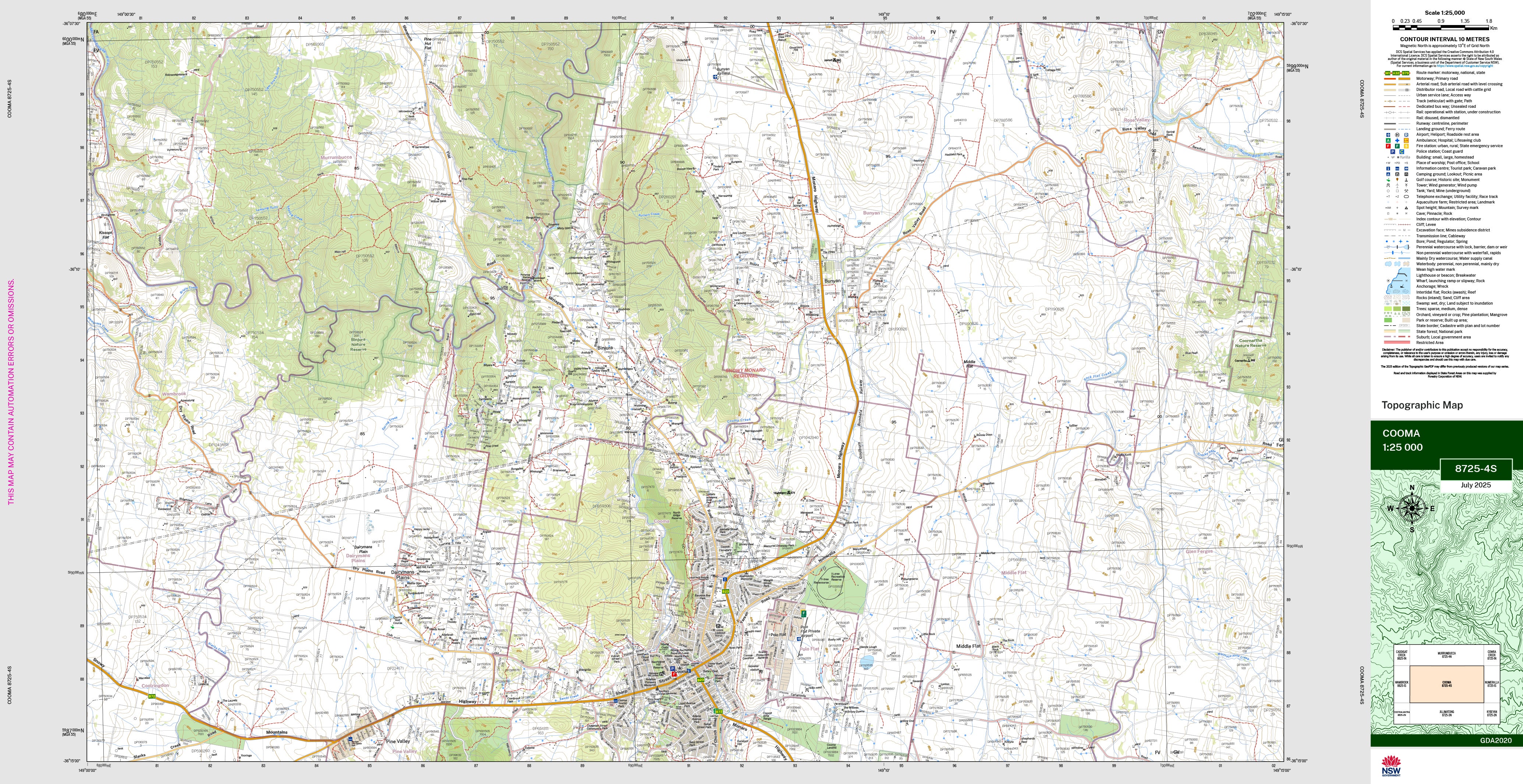 The Cooma 1:25,000 scale New South Wales topographic map shows contours, streams, roads, tracks, buildings, place names, points of interest, vegetation, selected administrative boundaries and much more.