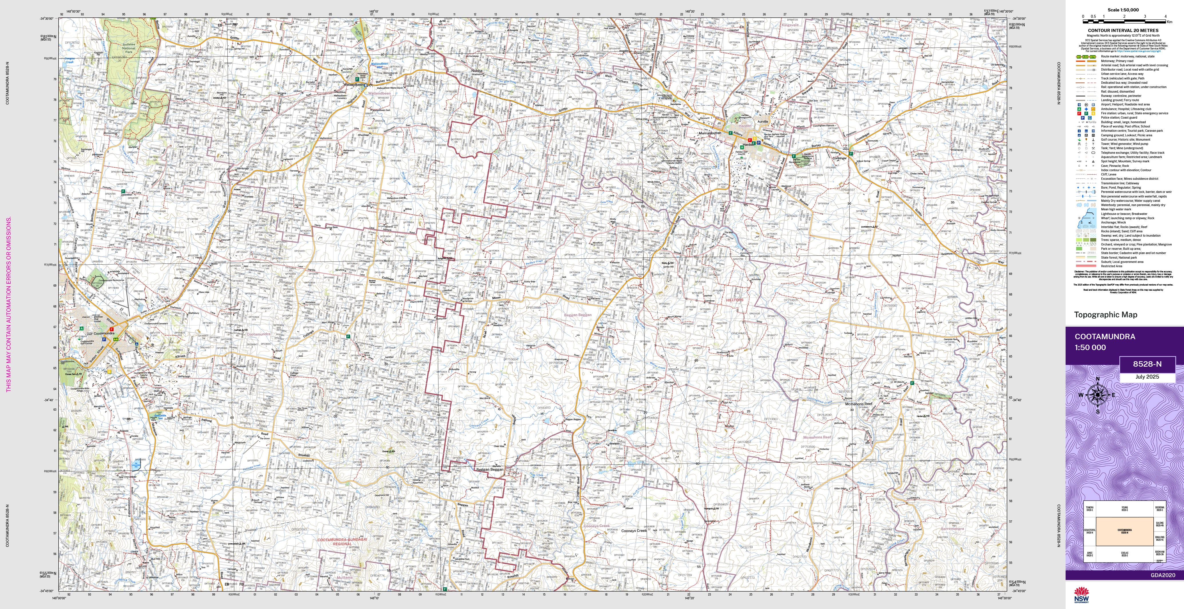 The Cootamundra 1:50,000 scale New South Wales topographic map shows contours, streams, roads, tracks, buildings, place names, points of interest, vegetation, selected administrative boundaries and much more.