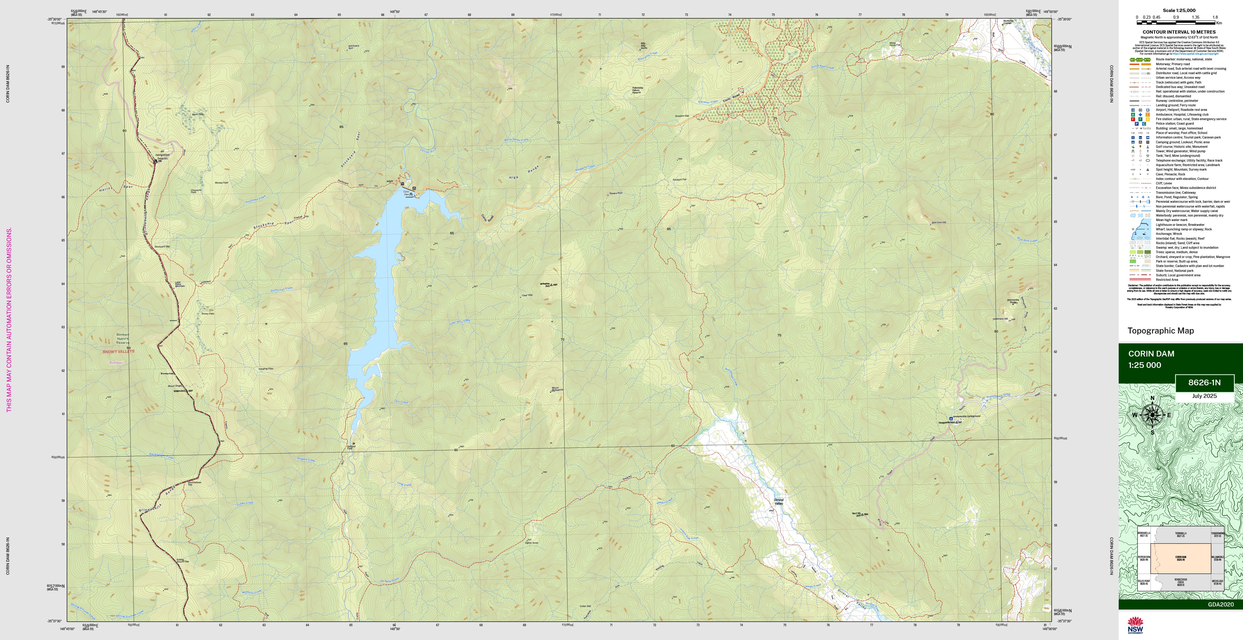 The Corin Dam 1:25,000 scale New South Wales topographic map shows contours, streams, roads, tracks, buildings, place names, points of interest, vegetation, selected administrative boundaries and much more.