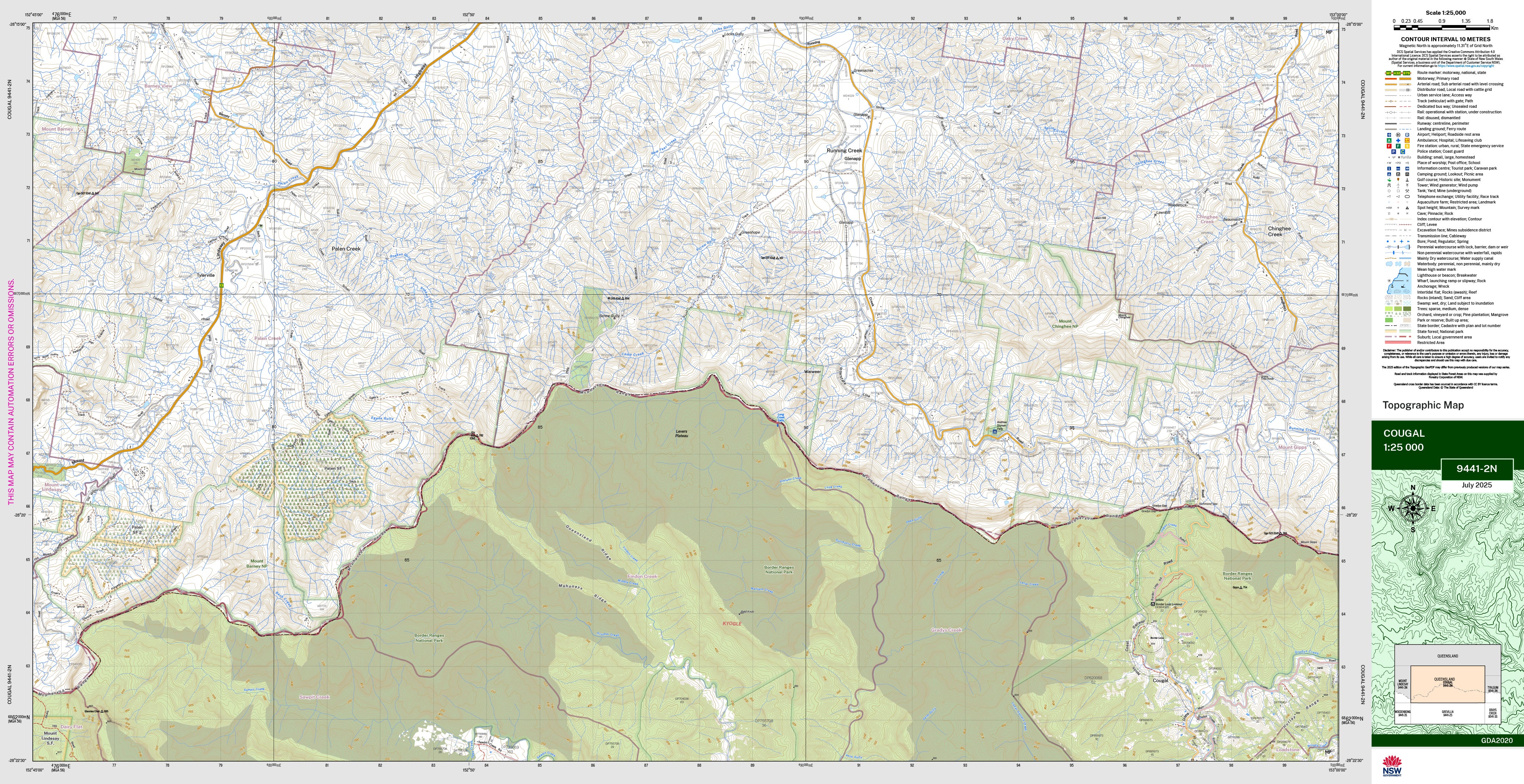 The Cougal 1:25,000 scale New South Wales topographic map shows contours, streams, roads, tracks, buildings, place names, points of interest, vegetation, selected administrative boundaries and much more.