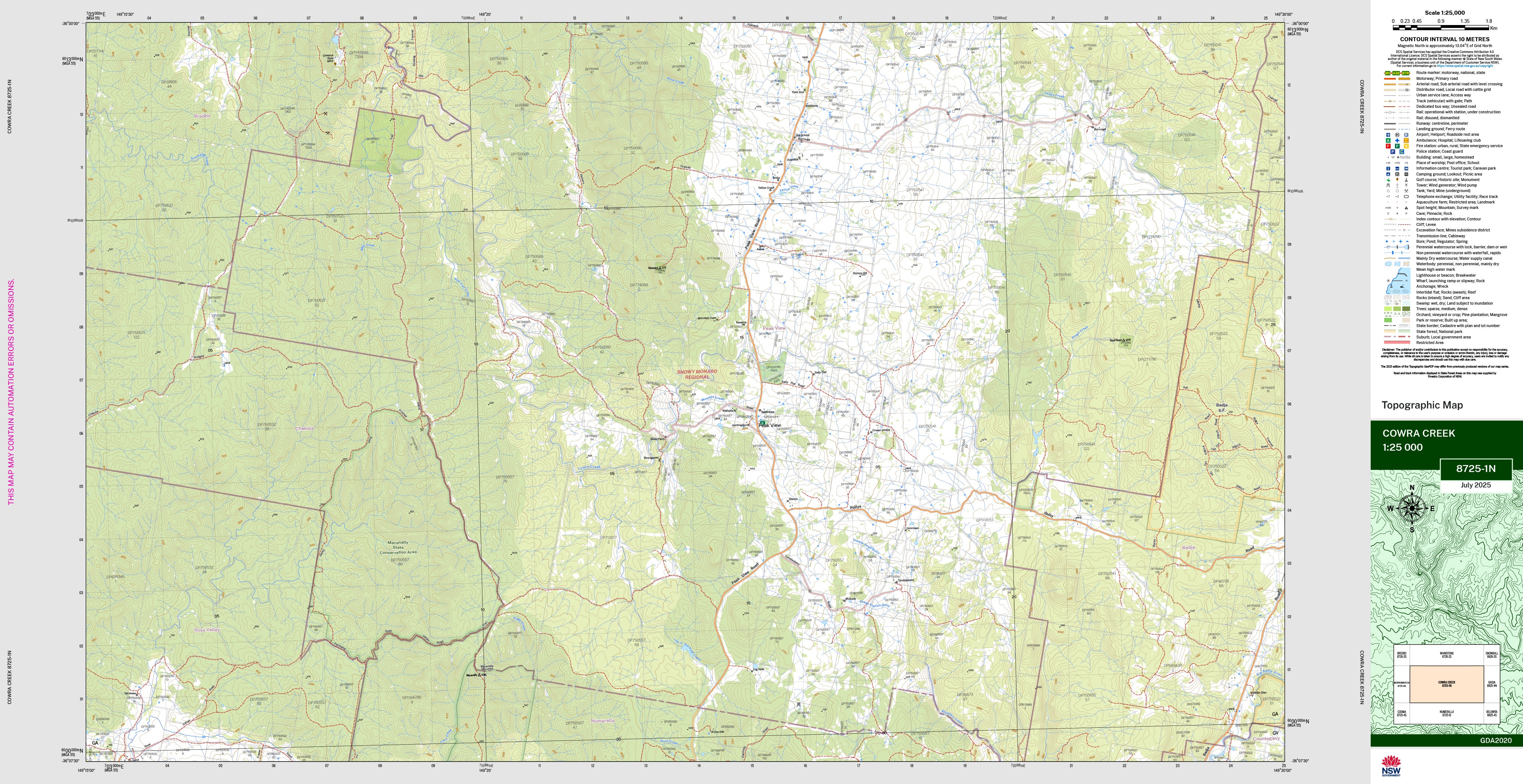 The Cowra Creek 1:25,000 scale New South Wales topographic map shows contours, streams, roads, tracks, buildings, place names, points of interest, vegetation, selected administrative boundaries and much more.