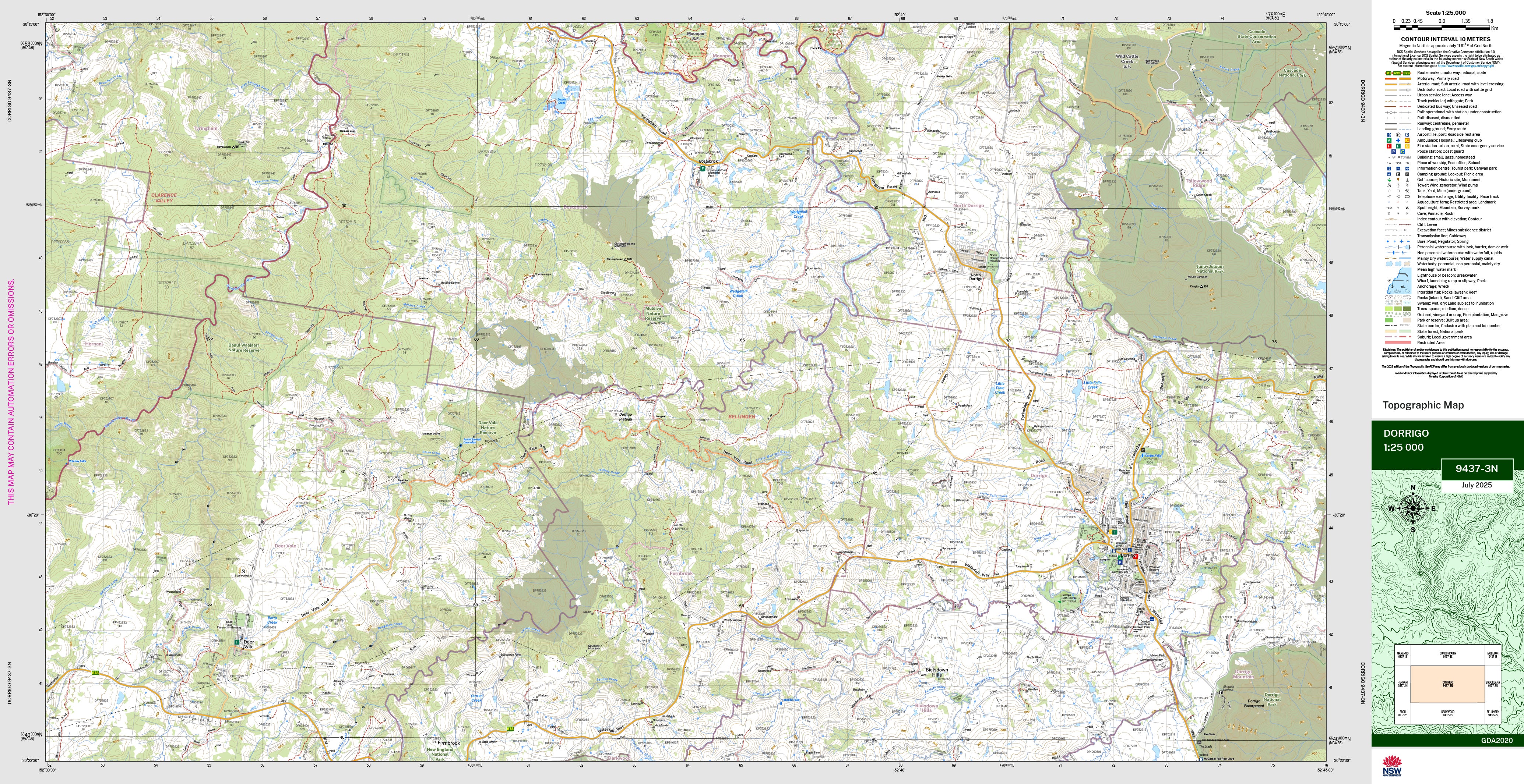 The Dorrigo 1:25,000 scale New South Wales topographic map shows contours, streams, roads, tracks, buildings, place names, points of interest, vegetation, selected administrative boundaries and much more.