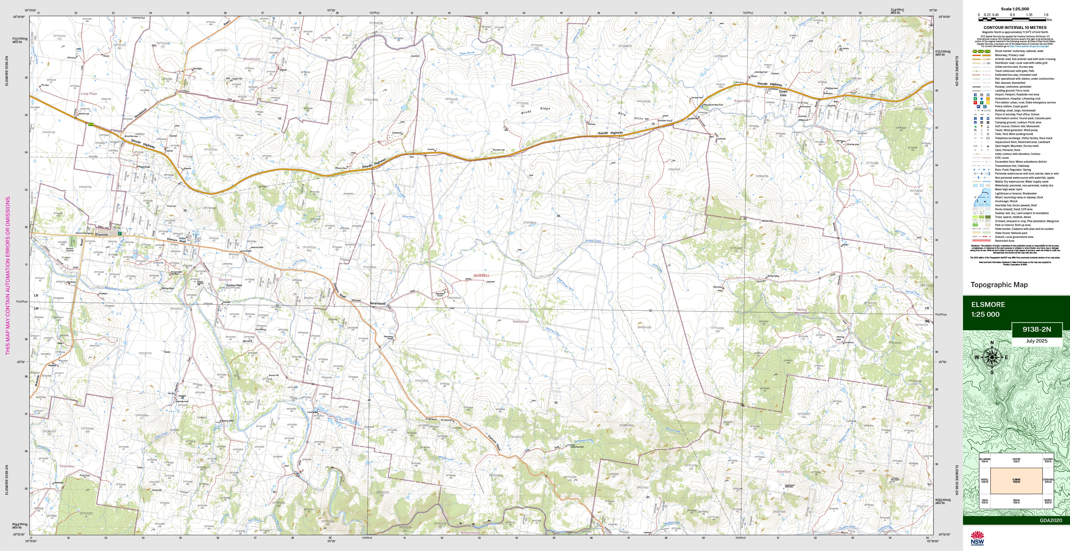 The Elsmore 1:25,000 scale New South Wales topographic map shows contours, streams, roads, tracks, buildings, place names, points of interest, vegetation, selected administrative boundaries and much more.