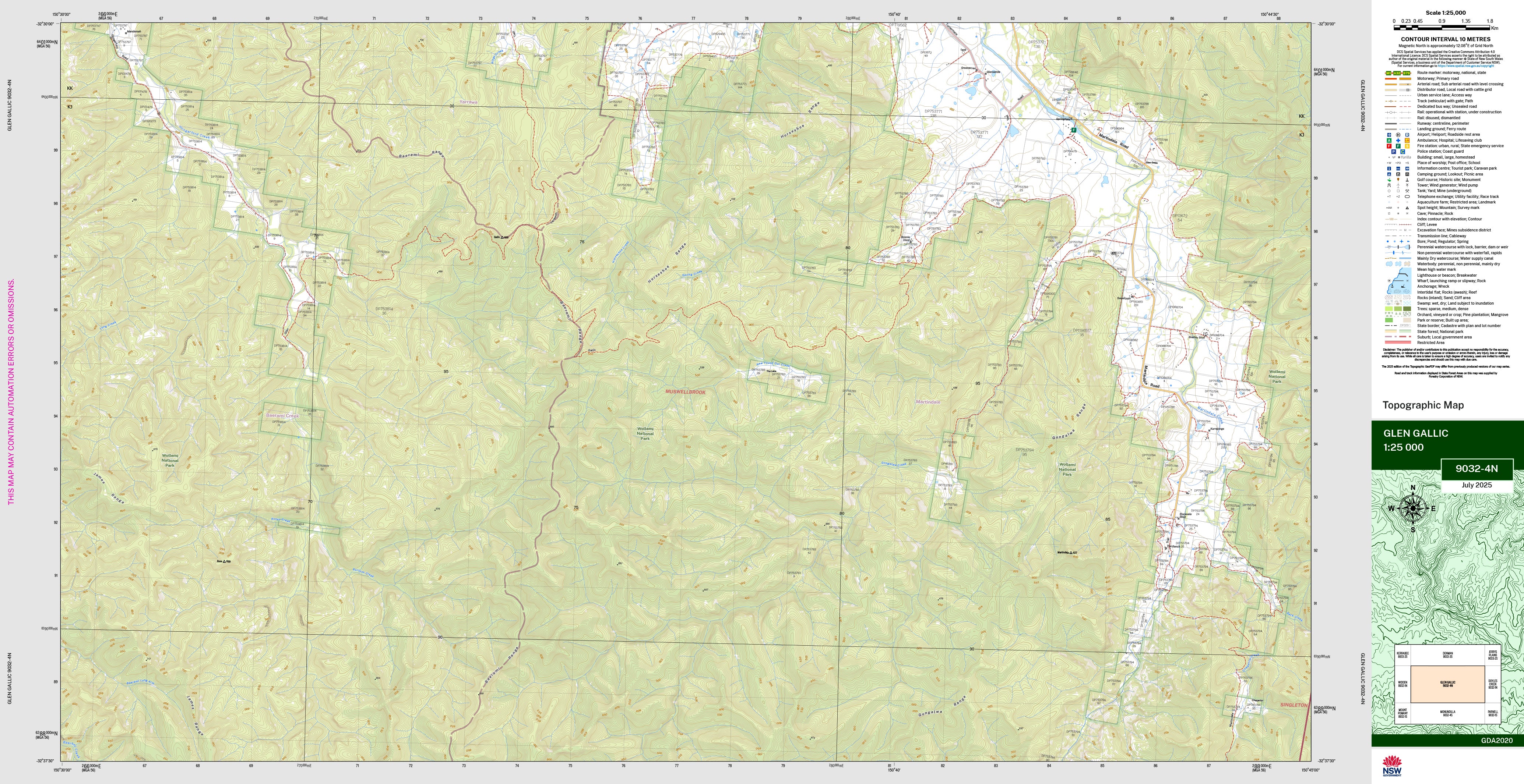 The Glen Gallic 1:25,000 scale New South Wales topographic map shows contours, streams, roads, tracks, buildings, place names, points of interest, vegetation, selected administrative boundaries and much more.