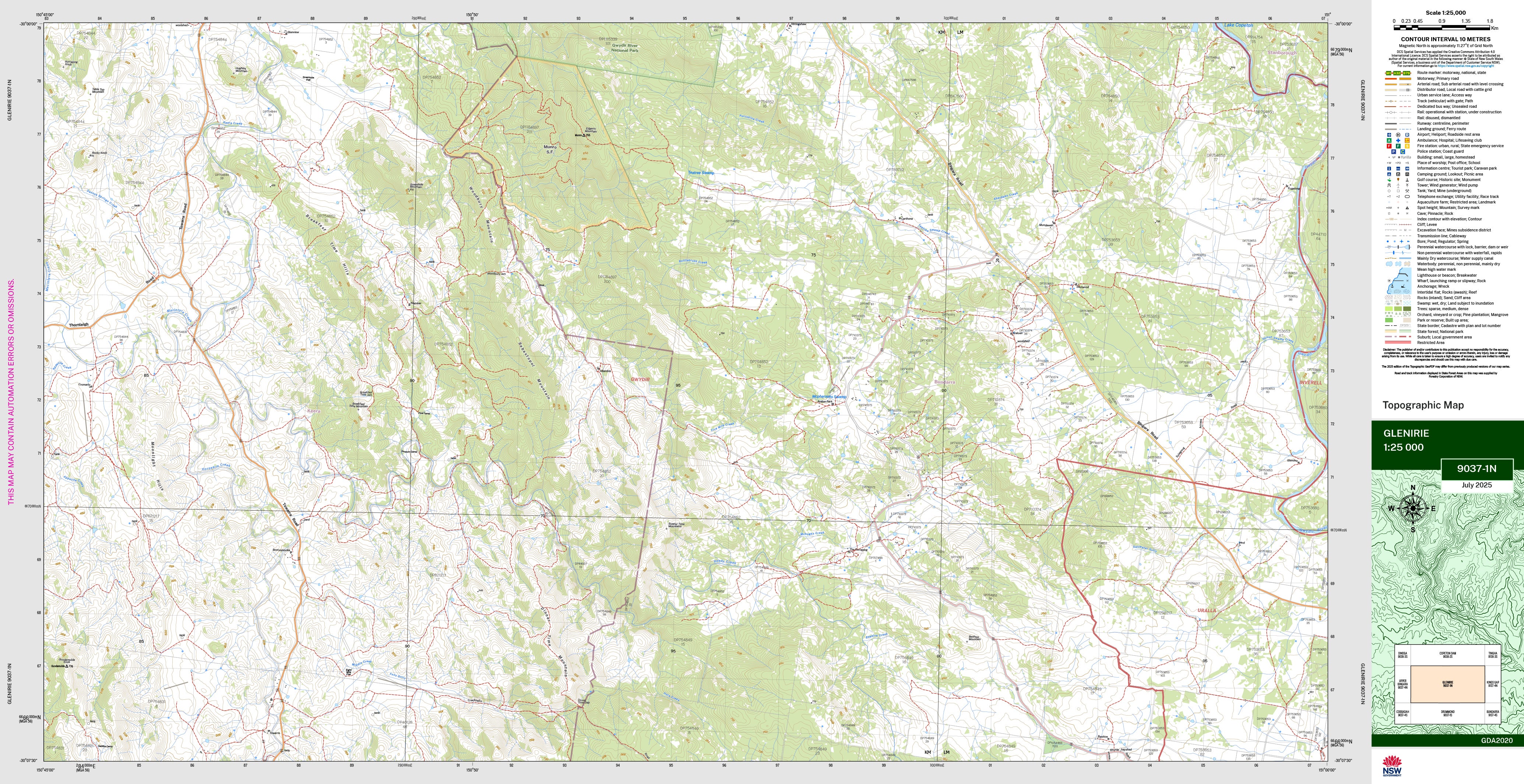 The Glenirie 1:25,000 scale New South Wales topographic map shows contours, streams, roads, tracks, buildings, place names, points of interest, vegetation, selected administrative boundaries and much more.