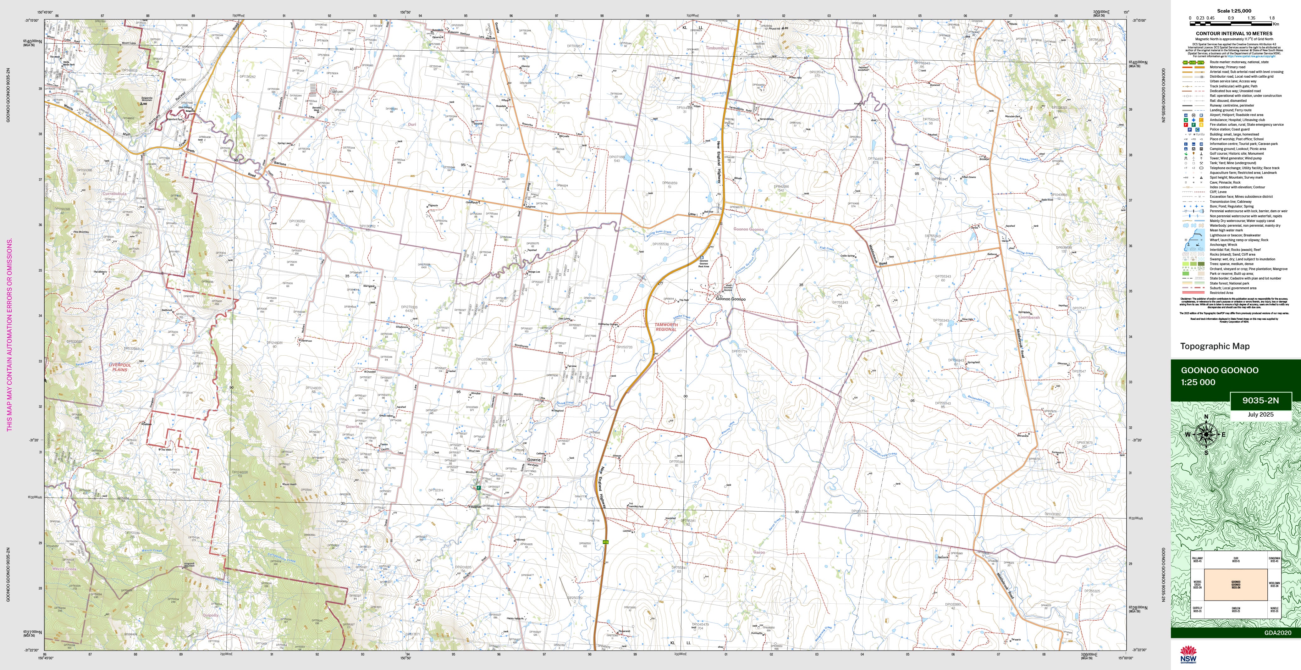 The Goonoo Goonoo 1:25,000 scale New South Wales topographic map shows contours, streams, roads, tracks, buildings, place names, points of interest, vegetation, selected administrative boundaries and much more.