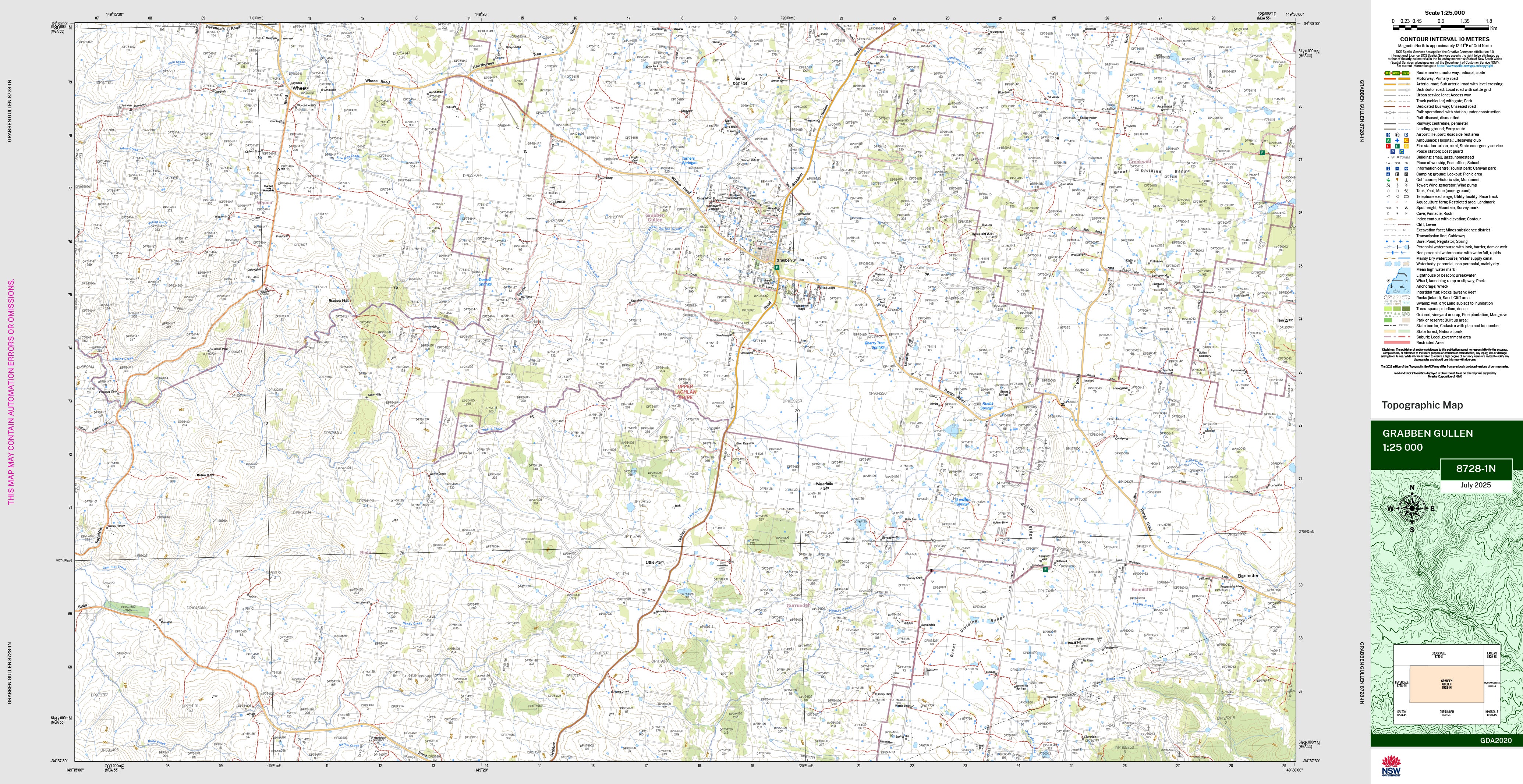 The Grabben Gullen 1:25,000 scale New South Wales topographic map shows contours, streams, roads, tracks, buildings, place names, points of interest, vegetation, selected administrative boundaries and much more.