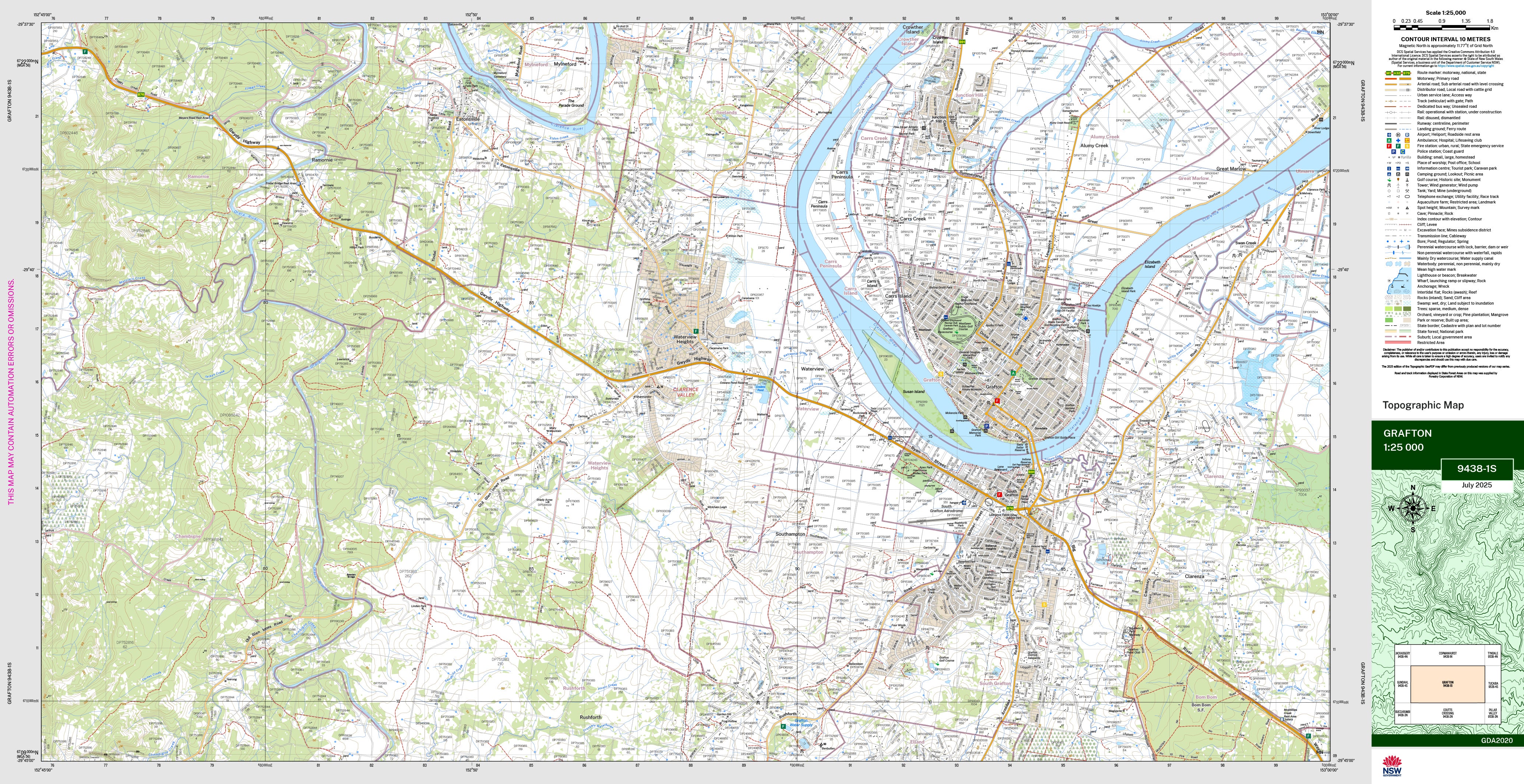 The Grafton 1:25,000 scale New South Wales topographic map shows contours, streams, roads, tracks, buildings, place names, points of interest, vegetation, selected administrative boundaries and much more.