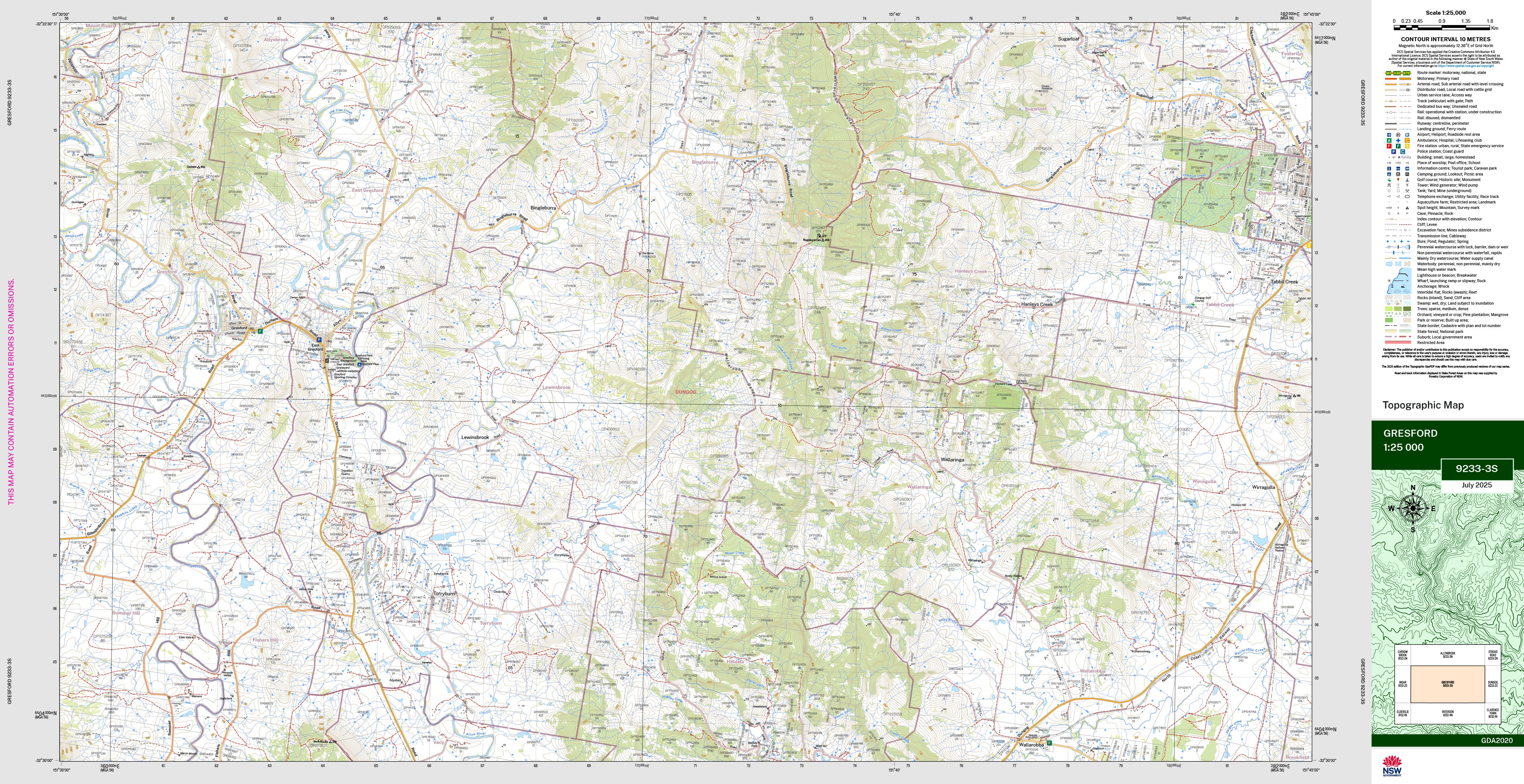 The Gresford 1:25,000 scale New South Wales topographic map shows contours, streams, roads, tracks, buildings, place names, points of interest, vegetation, selected administrative boundaries and much more.