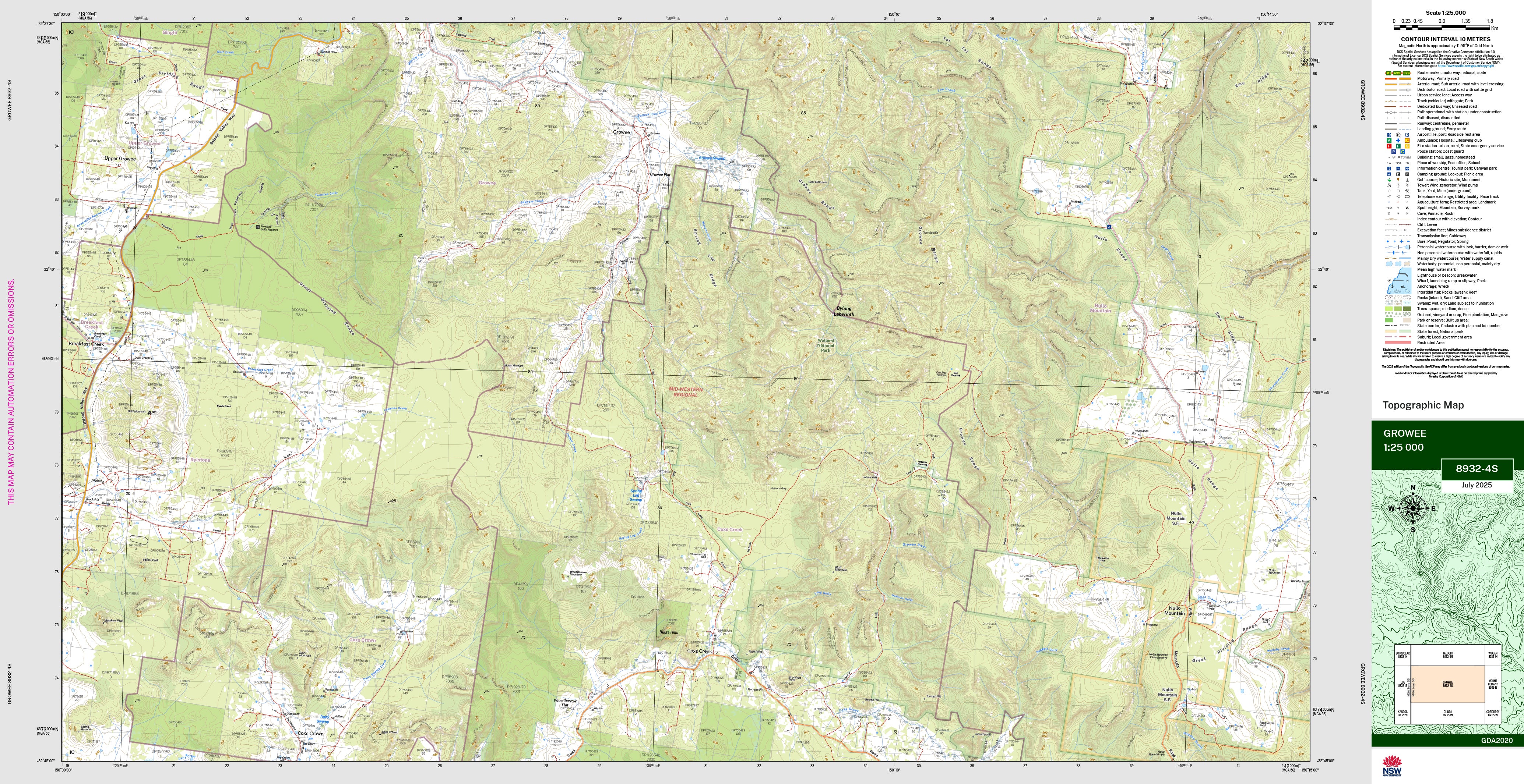 The Growee 1:25,000 scale New South Wales topographic map shows contours, streams, roads, tracks, buildings, place names, points of interest, vegetation, selected administrative boundaries and much more.