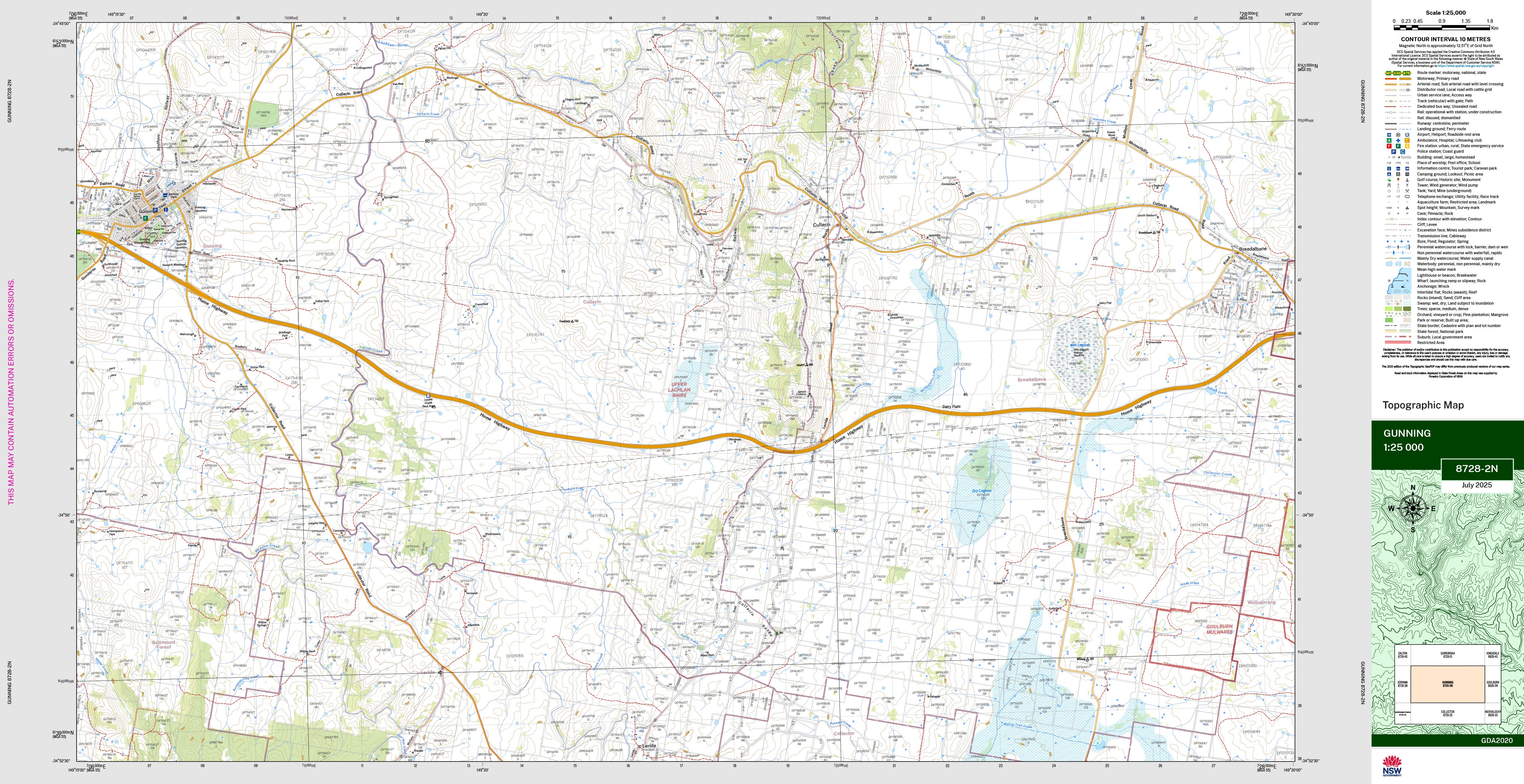 The Gunning 1:25,000 scale New South Wales topographic map shows contours, streams, roads, tracks, buildings, place names, points of interest, vegetation, selected administrative boundaries and much more.