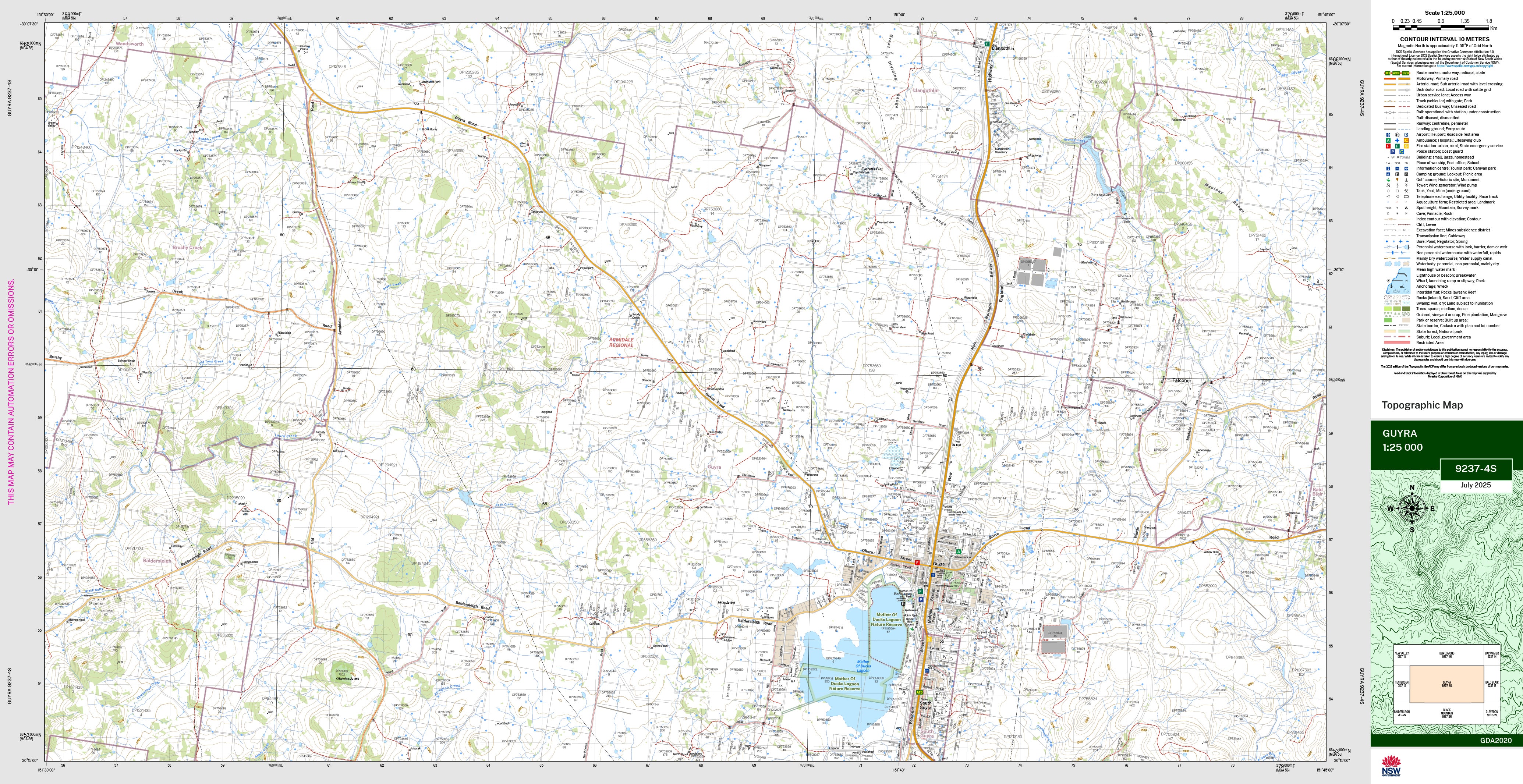 The Guyra 1:25,000 scale New South Wales topographic map shows contours, streams, roads, tracks, buildings, place names, points of interest, vegetation, selected administrative boundaries and much more.