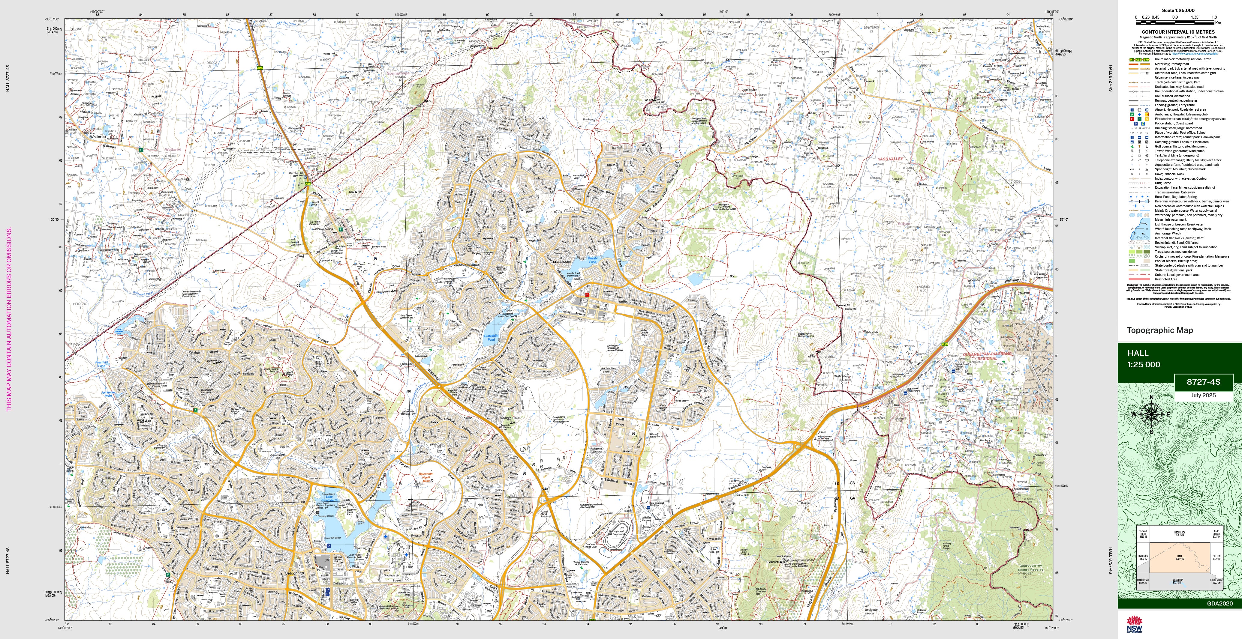 The Hall 1:25,000 scale New South Wales topographic map shows contours, streams, roads, tracks, buildings, place names, points of interest, vegetation, selected administrative boundaries and much more.