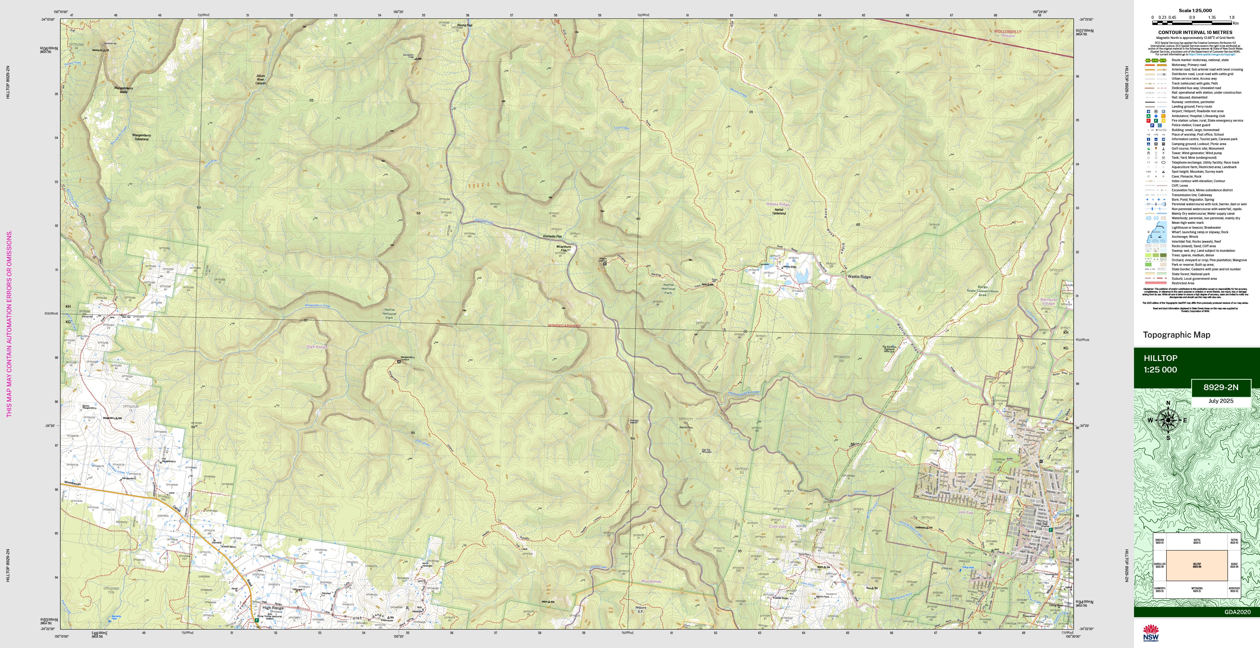 The Hill Top 1:25,000 scale New South Wales topographic map shows contours, streams, roads, tracks, buildings, place names, points of interest, vegetation, selected administrative boundaries and much more.