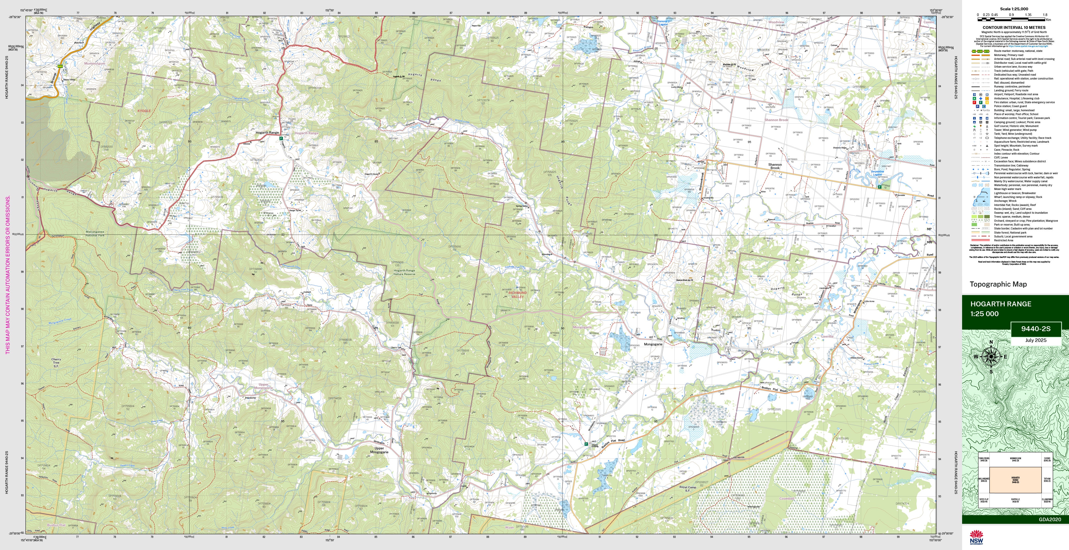 The Hogarth Range 1:25,000 scale New South Wales topographic map shows contours, streams, roads, tracks, buildings, place names, points of interest, vegetation, selected administrative boundaries and much more.