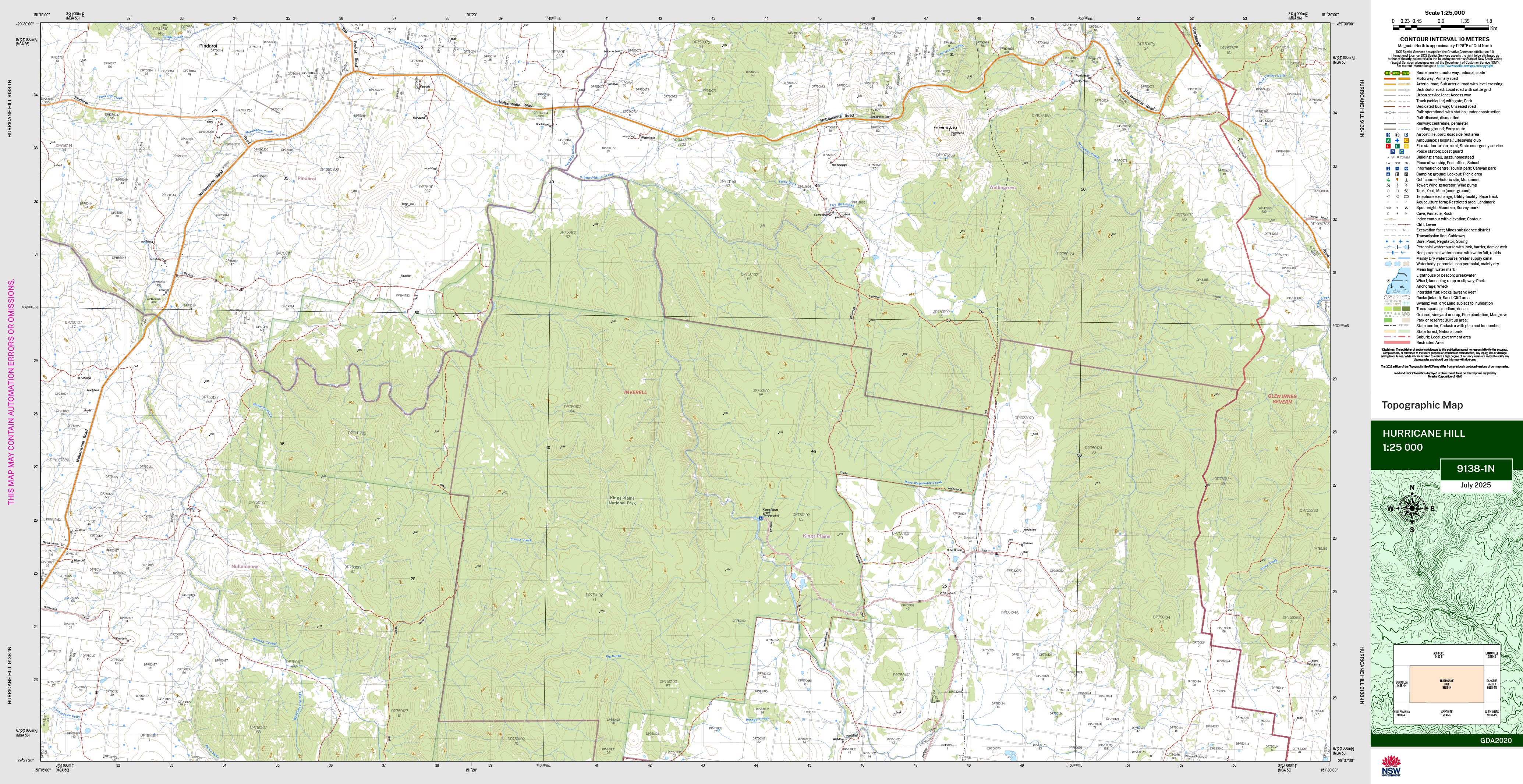 The Hurricane Hill 1:25,000 scale New South Wales topographic map shows contours, streams, roads, tracks, buildings, place names, points of interest, vegetation, selected administrative boundaries and much more.