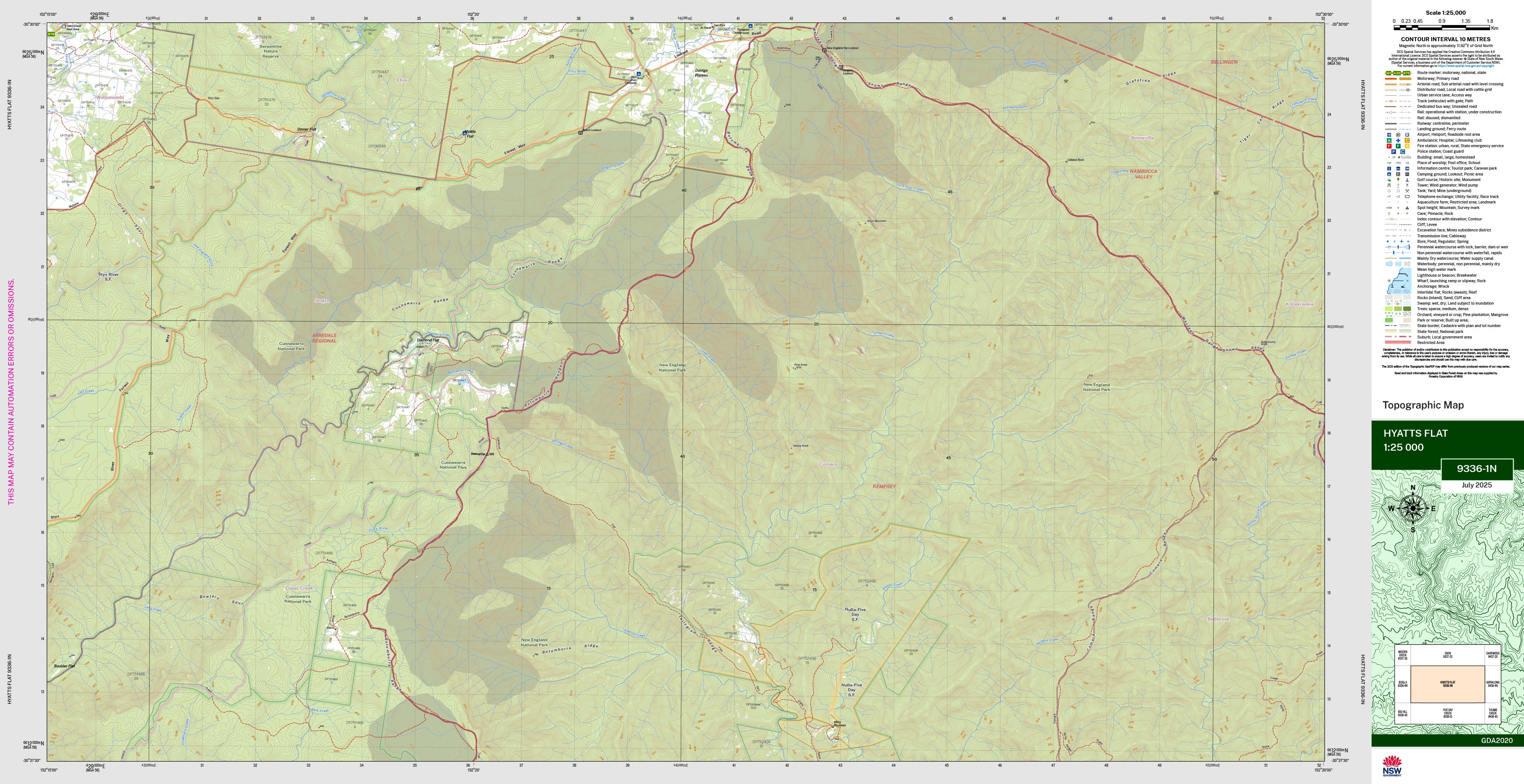 The Hyatts Flat 1:25,000 scale New South Wales topographic map shows contours, streams, roads, tracks, buildings, place names, points of interest, vegetation, selected administrative boundaries and much more.