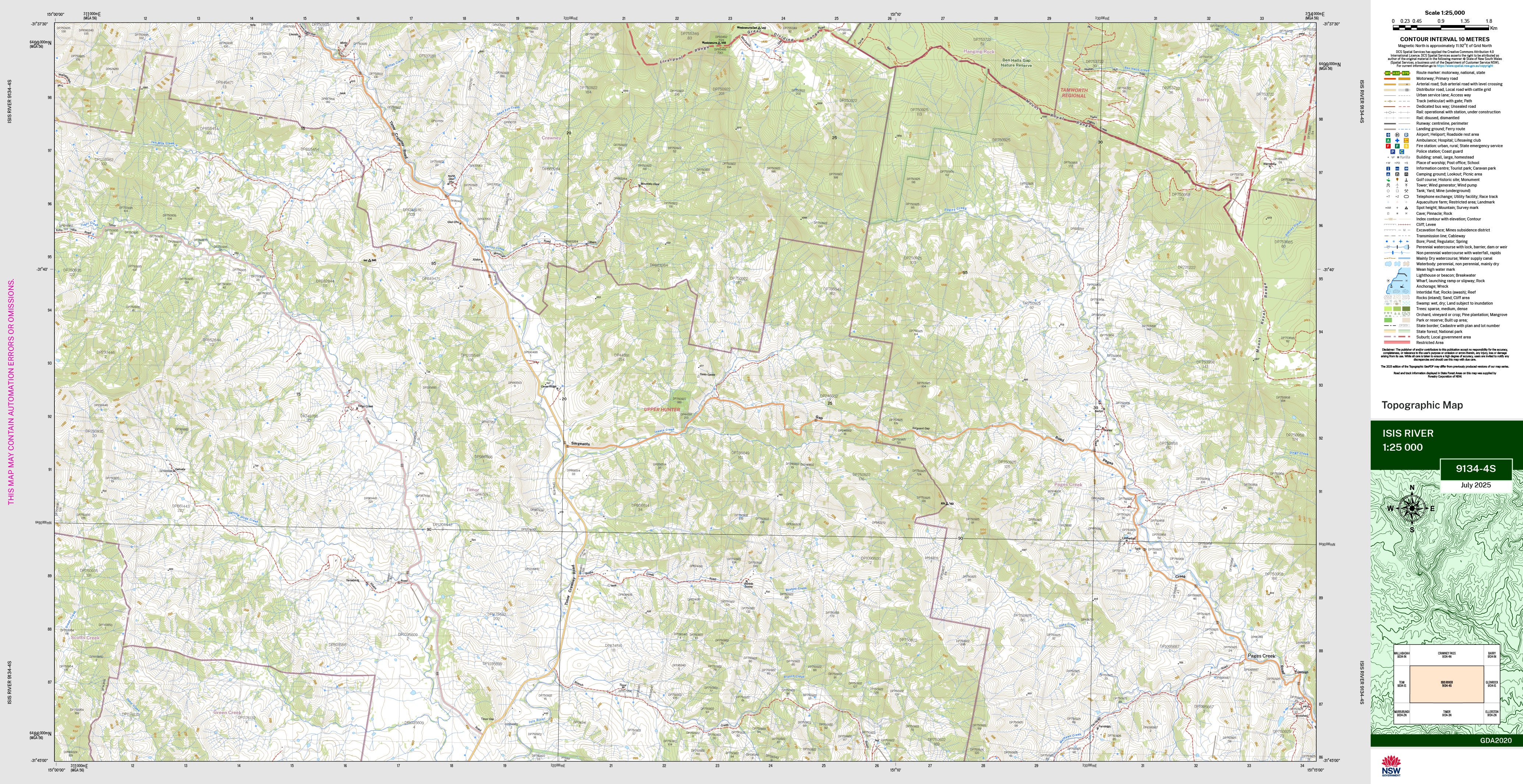 The Isis River 1:25,000 scale New South Wales topographic map shows contours, streams, roads, tracks, buildings, place names, points of interest, vegetation, selected administrative boundaries and much more.