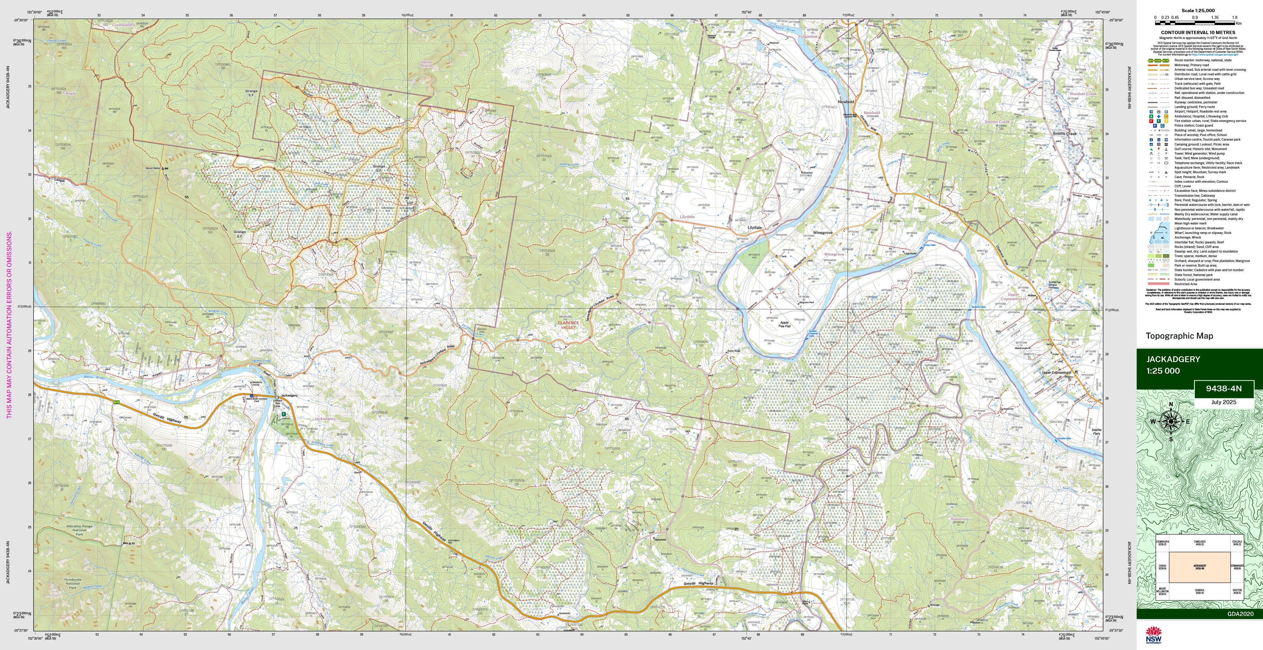 The Jackadgery 1:25,000 scale New South Wales topographic map shows contours, streams, roads, tracks, buildings, place names, points of interest, vegetation, selected administrative boundaries and much more.