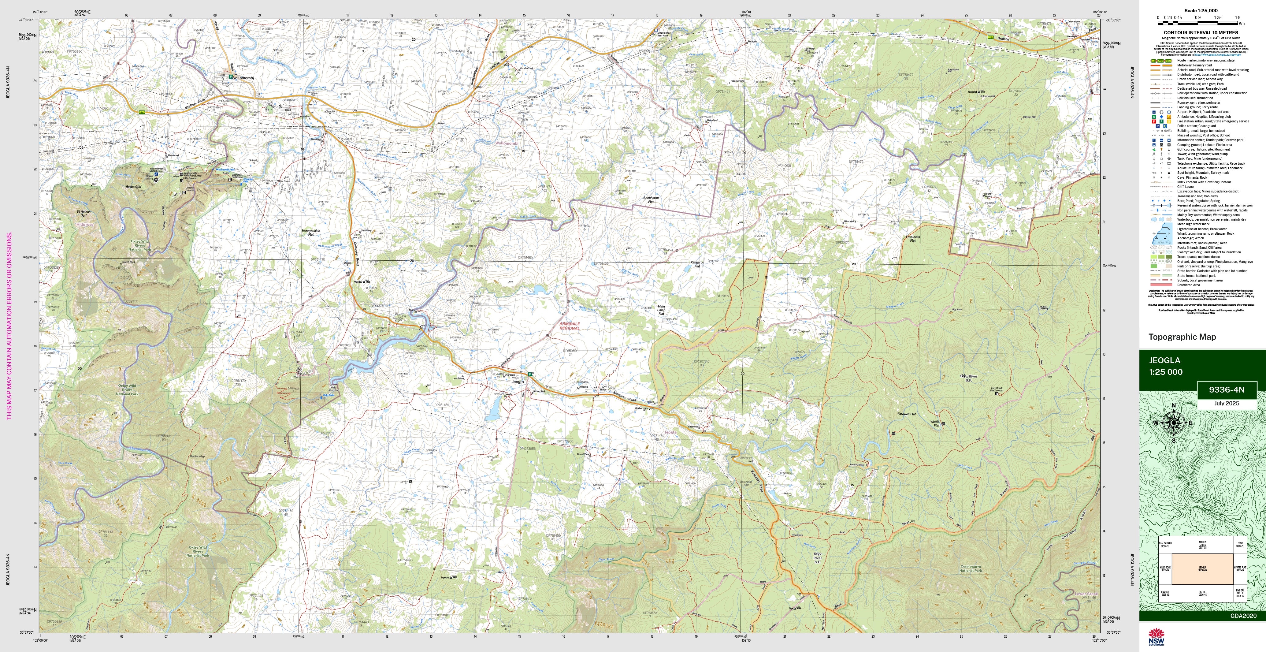 The Jeogla 1:25,000 scale New South Wales topographic map shows contours, streams, roads, tracks, buildings, place names, points of interest, vegetation, selected administrative boundaries and much more.